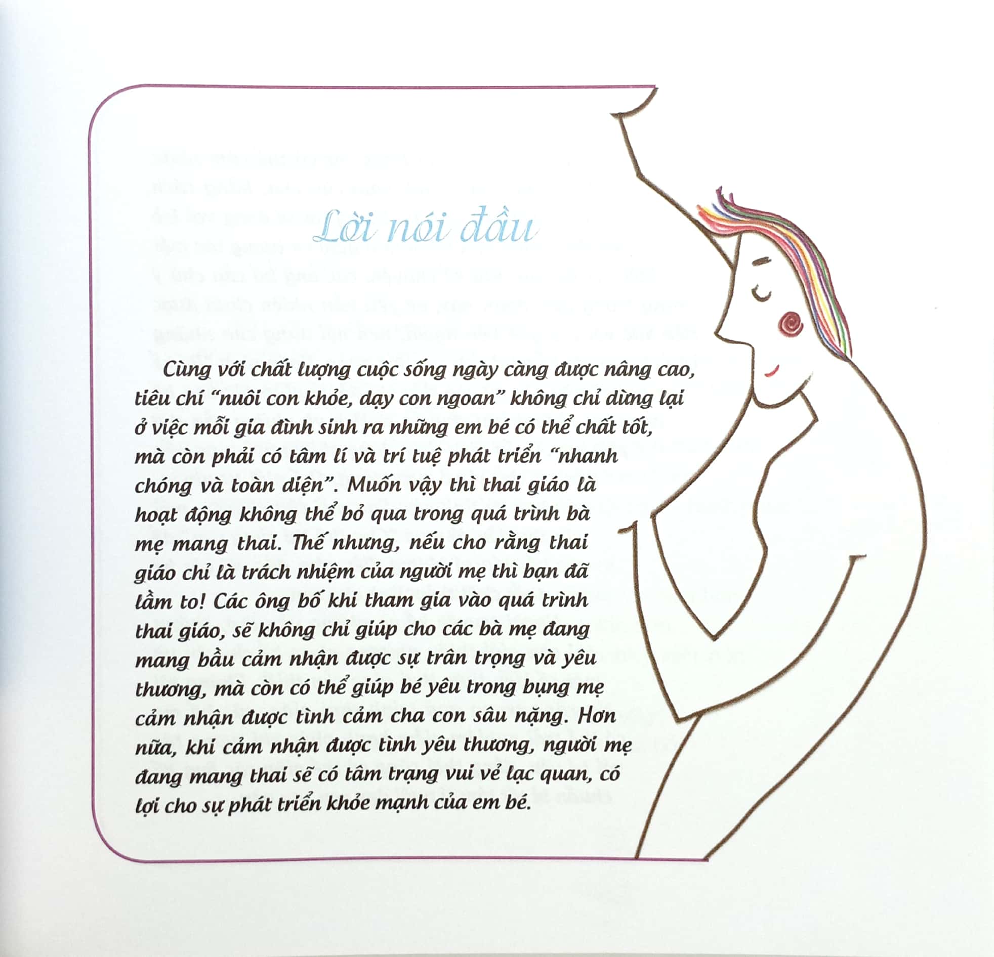 Cẩm Nang Dành Cho Mẹ Bầu Và Thai Nhi - Bố Kể Con Nghe Thai giáo là hành trình cần sự đồng hành của cả bố, mẹ và các thành viên khác trong gia đình. Khi chào đời, em bé nào cũng mang tiềm năng thiên tài như Edison, Shakespeare, Beethoven, Picasso. Nhưng làm sao để phát triển được tiềm năng ấy? Câu trả lời là: hãy tiến hành thai giáo thật khoa học. Nhiều ông bố bà mẹ coi thai giáo là một việc phức tạp, đòi hỏi nhiều công sức nhưng thực ra đơn giản vô cùng. Chỉ cần bố mẹ dành chút thời gian trước khi đi ngủ, giữ tâm trạng vui vẻ, cảm xúc ấm áp, nghe bản nhạc êm dịu hoặc kể chuyện bằng giọng nói dịu dàng với em bé trong bụng cũng là những cách thai giáo dễ làm mà hiệu quả. Cuốn sách này tuyển chọn những câu chuyện thai giáo thú vị để giúp các bố mẹ gắn kết tình cảm, kích thích não bộ, vun đắp trái tim biết yêu thương cùng những phẩm chất tốt đẹp cho bé ngay từ khi còn trong bụng mẹ. Những câu chuyện sinh động, tích cực, ngập tràn niềm vui trong sách sẽ dần gợi ra cho bé những tri thức về thế giới rực rỡ muôn màu và cha mẹ bé sẽ được trải nghiệm hành trình mang thai đong đầy yêu thương và hạnh phúc. Bằng việc yêu thương và quan tâm với em bé còn đang trong bụng mẹ, các thành viên trong gia đình sẽ góp phần tích cực trong việc xây dựng và hình thành nhân cách cho em bé trong tương lai. Bất cứ em bé nào được yêu thương như vậy sẽ chào đời mạnh khỏe và luôn có trái tim biết yêu thương hết mực. Mời các bạn cùng tìm đọc: