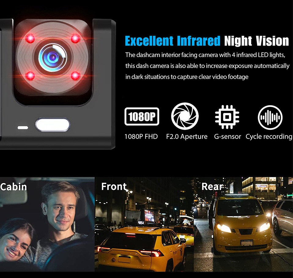 - Tính năng IR hồng ngoại quay ban đêm, camera trong với 4 đèn LED hồng ngoại và khẩu độ F / 1.8 có thể xử lý các điều kiện ánh sáng yếu và đảm bảo hình ảnh video hoàn hảo ngay cả khi cabin không đủ sáng hoặc vào ban đêm.