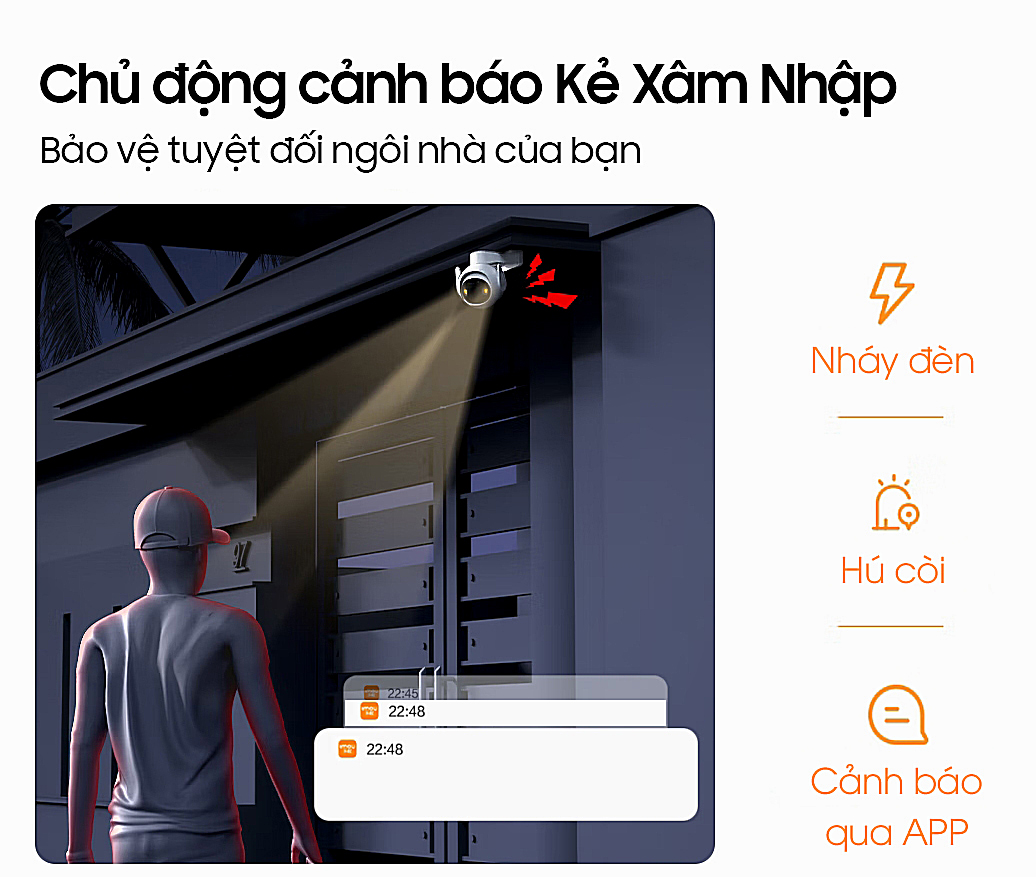 – Cảnh báo chủ động: bật đèn và hú còi (110dB) khi phát hiện có đối tượng xâm nhập.