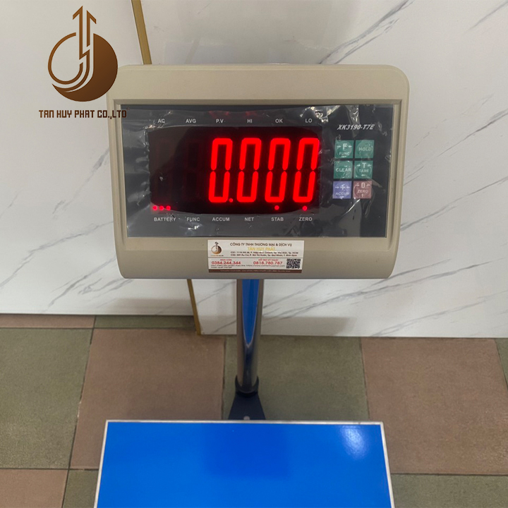 Chất liệu cân: Khung cân hợp kim thép vuông 4 sơn tĩnh điện dày 1.5 ly, mặt bàn cân inox dày 1.5 ly, đầu chỉ thị nhựa ABS.