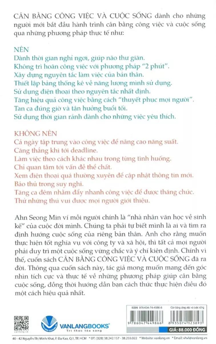 Ahn Seong Min ví mỗi người chính là “nhà nhân văn học về sinh kế” của cuộc đời mình. Chúng ta phải tự biết mình là ai và tìm ra định hướng cuộc sống của riêng bản thân. Anh cho rằng muốn thực hiện tốt nghĩa vụ với công ty và xã hội, thì tất cả mọi người phải duy trì một cuộc sống vững chắc và ý chí kiên định. Chính vì thế, cuốn sách CÂN BẰNG CÔNG VIỆC VÀ CUỘC SỐNG đã ra đời. Thông qua cuốn sách này, tác giả mong muốn mang đến góc nhìn tích cực và thực tế về những phương pháp giúp cân bằng cuộc sống, đồng thời hướng dẫn bạn cách thức thực hiện điều đó một cách hiệu quả nhất.