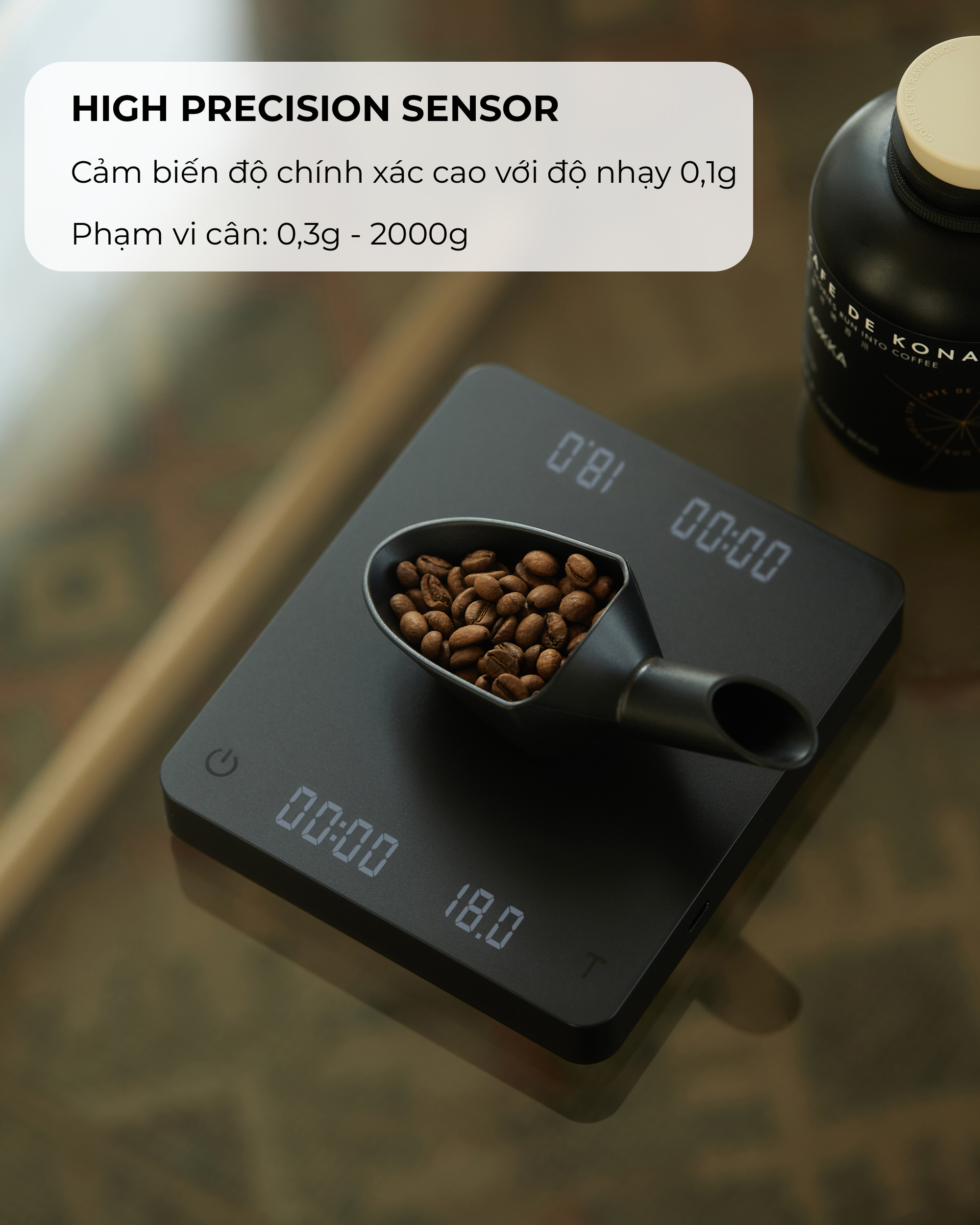 CÂN ĐIỆN TỬ GHOST 2 MÀN HÌNH HIỂN THỊ   Với ngôn ngữ thiết kế vuông bo tròn ở cạnh giản đơn, hiện đại và nhỏ gọn. Nhưng được trang bị những tính năng chuẩn nhất. Một sản phẩm công nghệ phục vụ cho dân barista chuyên nghiệp.   Cân với bề mặt kính sang trọng, cao cấp và rất dễ lau sạch. CHỨC NĂNG NỔI BẬT   Tính năng độc đáo DUAL SCREEN với 2 màn hình hiển thị trạng thái giúp barista và khách hàng (hoặc học viên) cùng lúc quan sát được thông tin hiển thị của quá trình pha.   Sử dụng pin Lithium sạc lại qua cổng USB type C tích hợp thêm khe cắm pin mở rộng với 3 viên AAA giúp cân hoạt động liên tục trong trường hợp không thể sạc.   Thời gian phản hồi cực nhanh – 50ms kể từ khi có thay đổi về khối lượng trên cân.   Tự động tắt khi không sử dụng   Màn hình LED siêu sáng: Sử dụng trong mọi điều kiện ánh sáng kể cả tắt đèn thường chỉ xuất hiện trên những dòng cân cao cấp hơn như Acaia hoặc Brewista.   Tự động tắt đèn sau 15s.   Phím bấm cảm ứng: Quá nhẹ nhàng khi sử dụng.   Bề mặt cân rộng rãi: Để cả 1 bình pha Chemex 6 cup lên mà vẫn thoải mái.   Tích hợp bộ đếm thời gian: Dành cho những ai sử dụng cân pha Pour over.