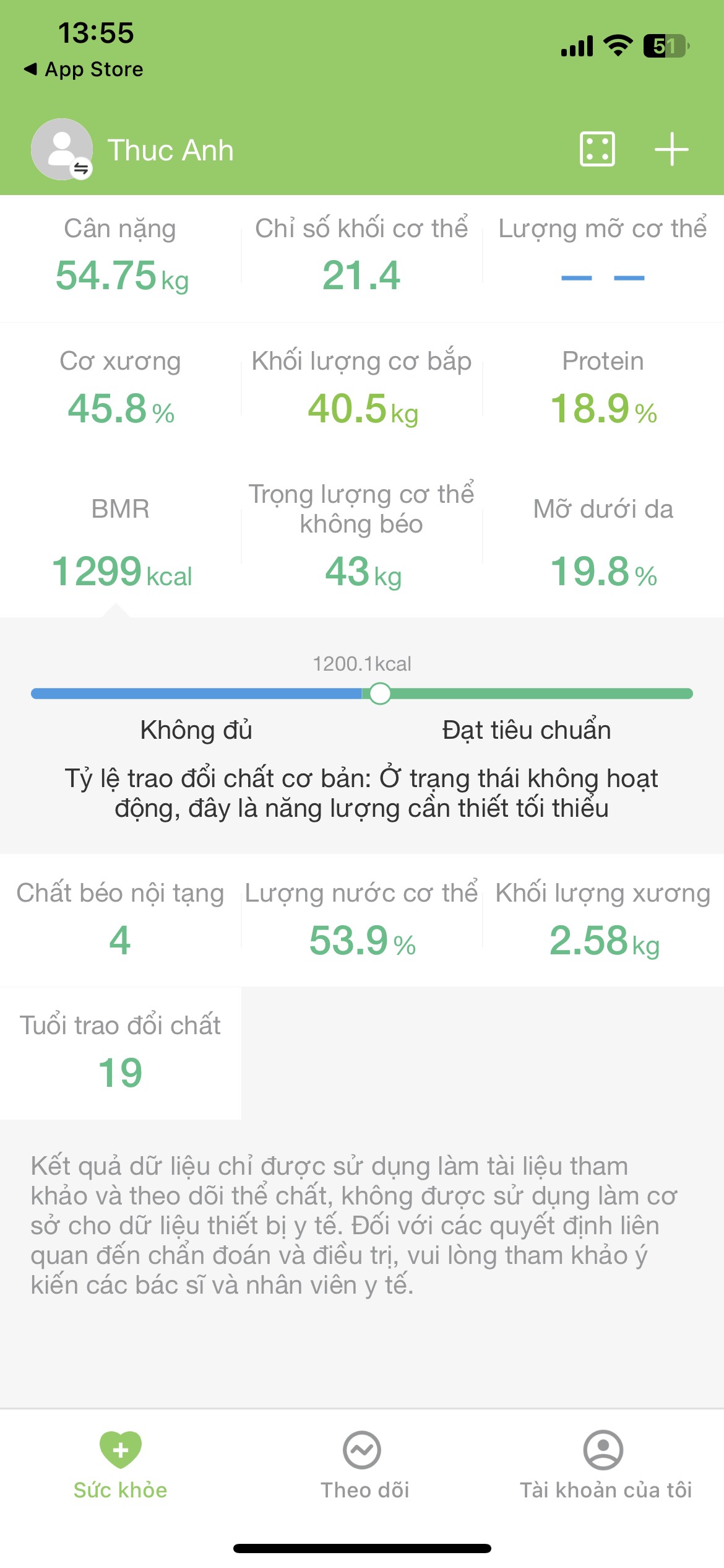 - Đo được 13 chỉ số: lượng chất béo, lượng nước, lượng cơ, BMI, BMR, Protein, Tuổi chuyển hóa...