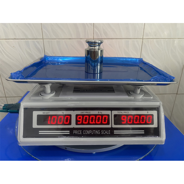 Hiển thị: 3 màn hình LED đỏ trước sau, số to, rõ, dễ nhìn, hiển thị: Khối lượng, Đơn giá, Thành tiền.