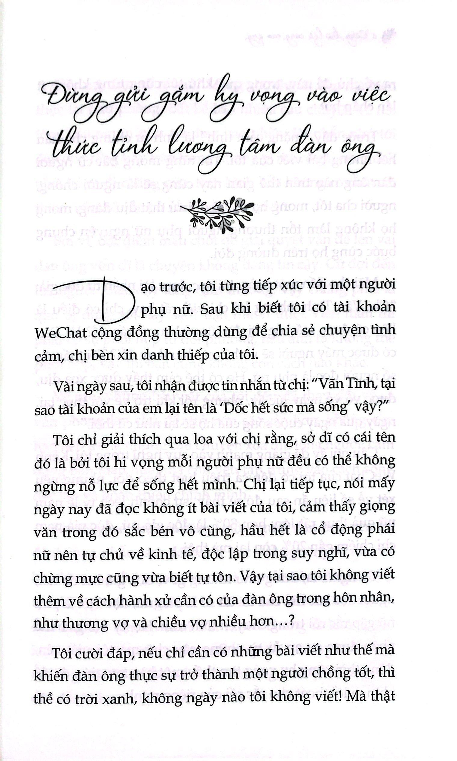Này cô gái, bất luận cuộc đời mang đến cho ta bao nhiêu chông gai thử thách, xin đừng tự coi nhẹ chính mình, đừng buông bỏ bản thân và phụ thuộc vào người khác. Hãy luôn giữ vững niềm tin rằng, số phận của ta nằm trong chính ta, không nằm trong tay ông Trời. Độc lập về cuộc sống, tư tưởng và kinh tế giúp chúng ta vĩnh viễn không mất đi quyền lựa chọn trong tay mình. Không ai thay chúng ta chịu trách nhiệm về cuộc đời mình. Thế nên, dù đang hạnh phúc đi nữa, trên đường đời cũng không tránh khỏi những tháng ngày phải độc bước tiến lên. Càng độc lập càng cao quý – Hãy nhớ lấy, cô gái nhé!