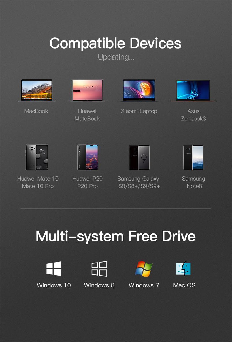 - Cắm và chạy, không cần cài đặt bất kỳ trình điều khiển / phần mềm nào. Tương thích với hầu hết các thiết bị USB C, chẳng hạn như MacBook Pro 2018/2017/2016, MacBook Air 2018, iMac 2018, iPad Pro 2018, Chromebook Pixel, Dell XPS 13/15 , HP Spectre X2 / X360, Acer Spin7, Samsung S8 / S9 +,