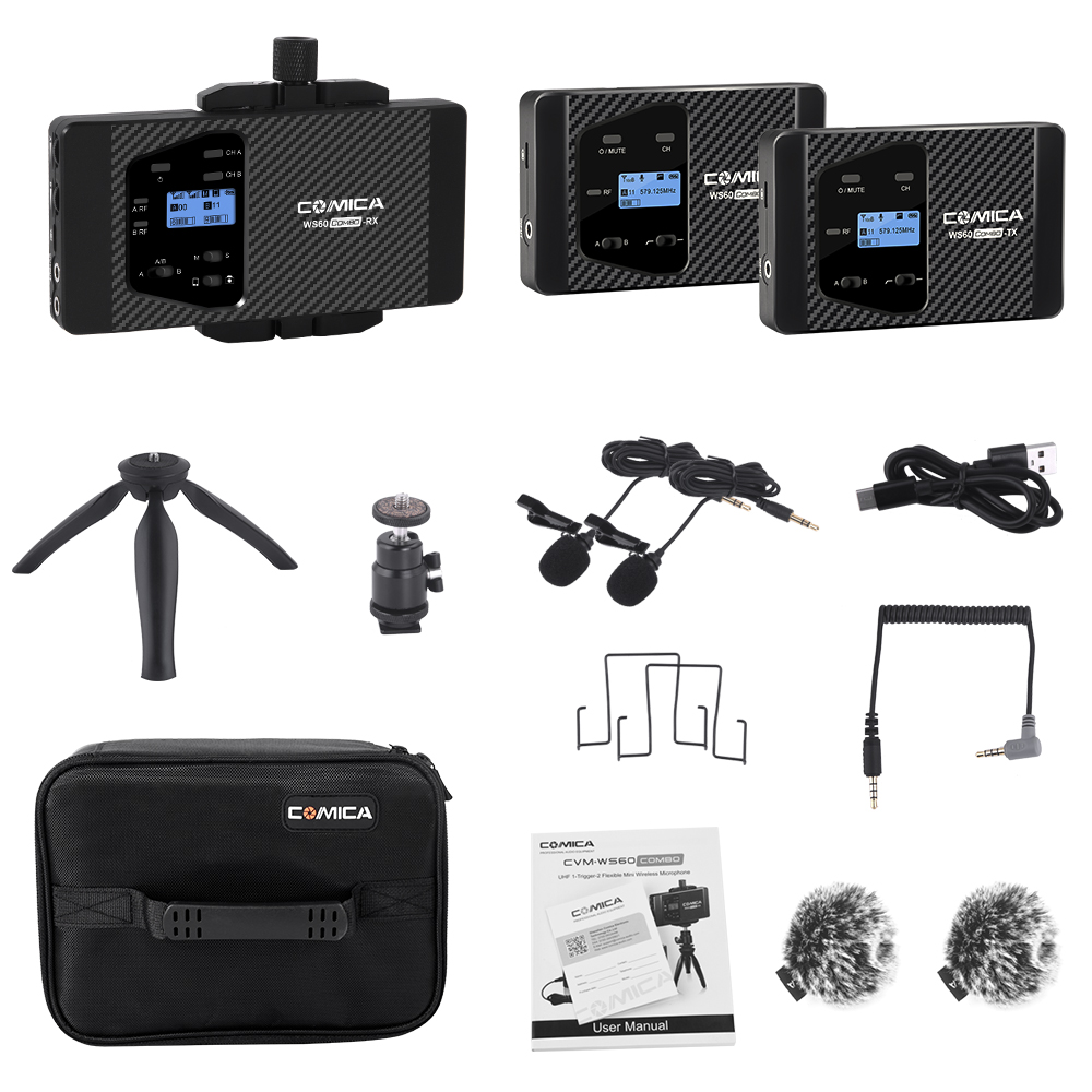 • WS60 COMBO is a Flexible Mini wireless microphone with dual-transmitter triggered by one receiver, which charged by three AAA batteries; It utilizes UHF wireless FM technology and LCD high-resolution lattice screen, 10-level adjustable volume, and is integrated into LCF(Low cut filter), Stereo/Mono switchable audio mode, MIC/LINE IN Input Mode Automatically, Smartphone/Camera Mode Switch, Sound pick up dynamic display and other functions; Meanwhile the high-quality microphone comes with strong shielding anti-noise performance equals broadcast level.