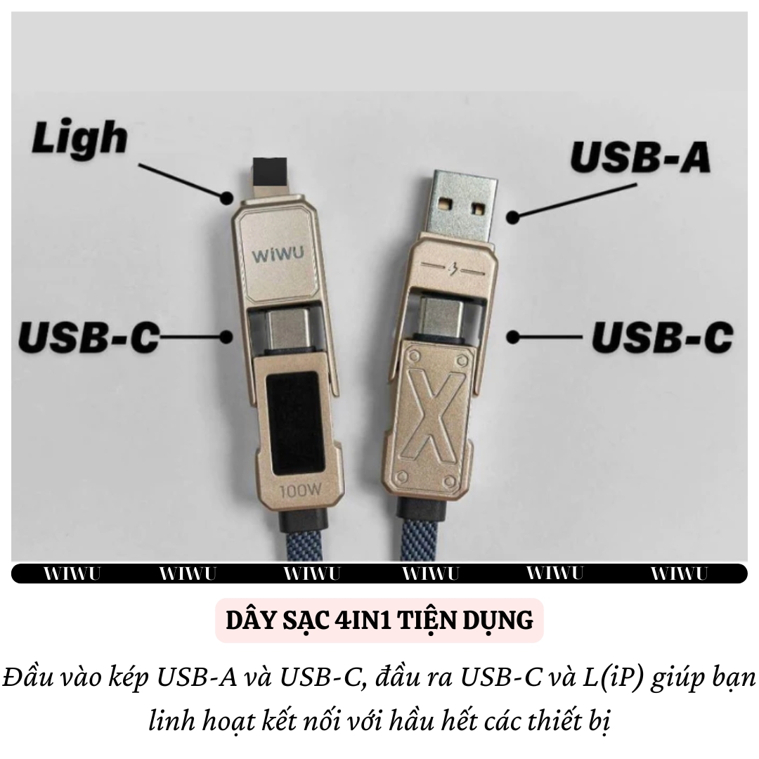 Cáp Sạc Nhanh WIWU Titan 4in1 100W Wi-C039 – Màn hình LED hiển thị, siêu bền, sạc được laptop ĐẶC ĐIỂM NỔI BẬT Màn hình LED hiển thị công suất sạc thời gian thực