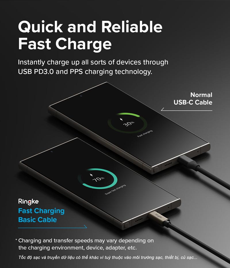 Cáp sạc nhanh RINGKE Fast Charging Basic Cable C-to-C ƯU ĐIỂM SẢN PHẨM - Cáp sạc nhanh Ringke Fast Charging Basic Cable hỗ trợ công nghệ PD 3.0 (Power Delivery), cho phép sạc nhanh các