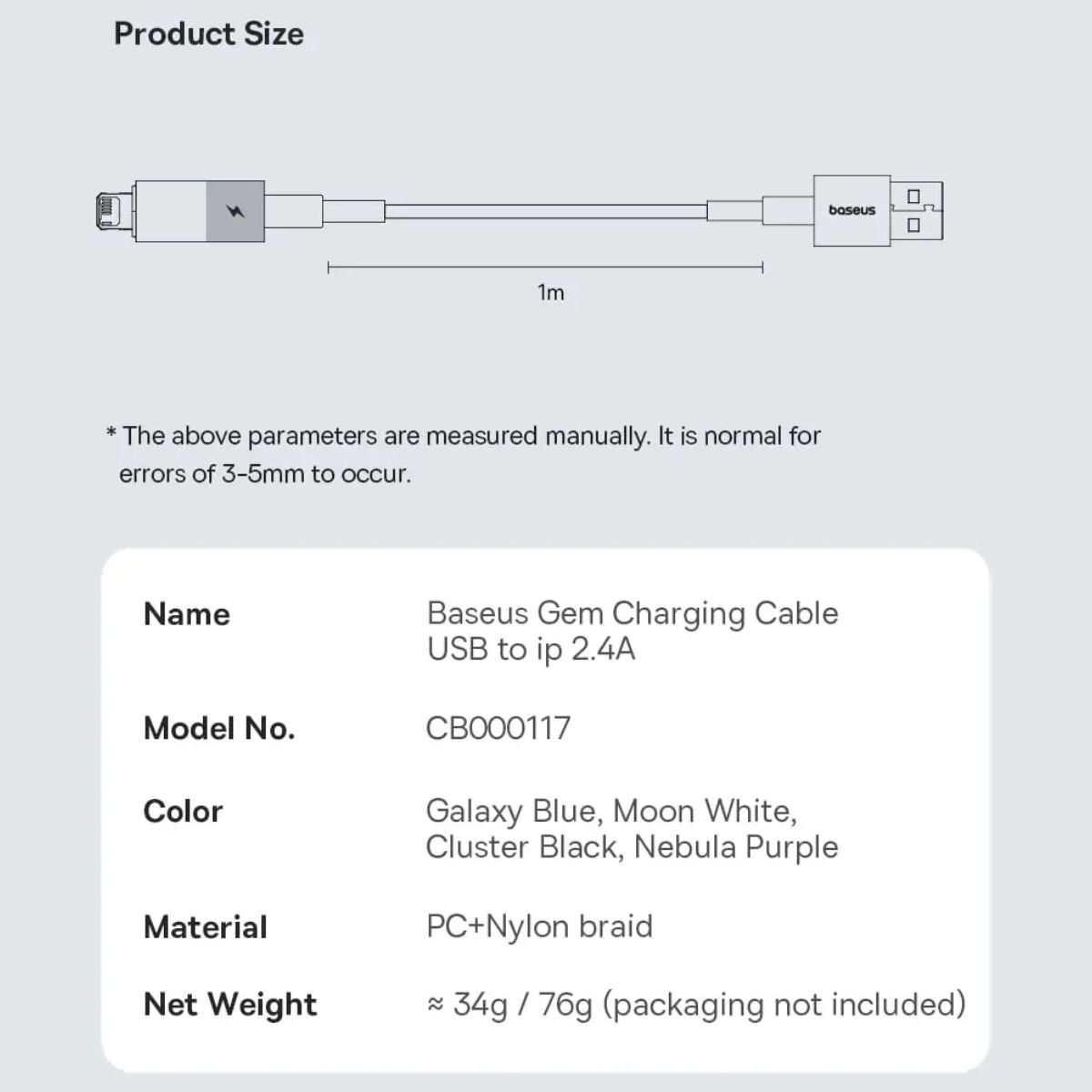 - Cáp sạc Baseus Gem được cung cấp với hai tùy chọn chiều dài: 1M và 2M, giúp người dùng linh hoạt trong việc sử dụng cáp trong các tình huống khác nhau. Với chiều dài 1M, bạn có thể dễ dàng sạc và sử dụng thiết bị ở khoảng cách gần. Trong khi đó, với chiều dài 2M, người dùng có thể thoải mái sử dụng thiết bị trong không gian rộng hơn mà không bị hạn chế về khoảng cách kết nối