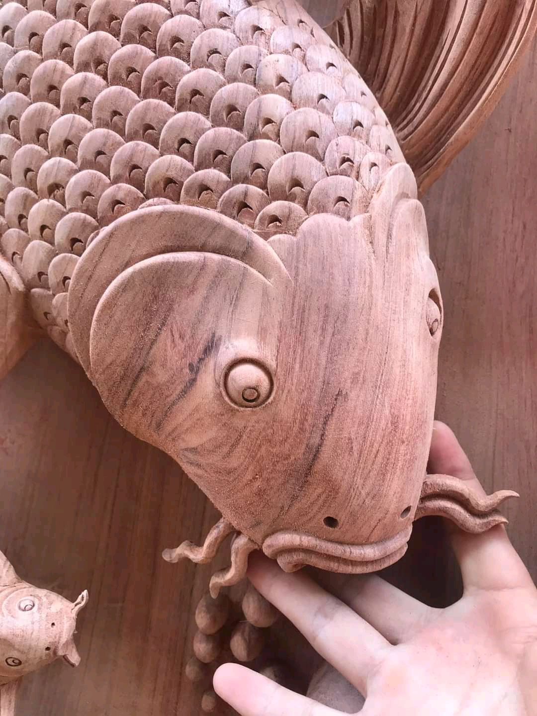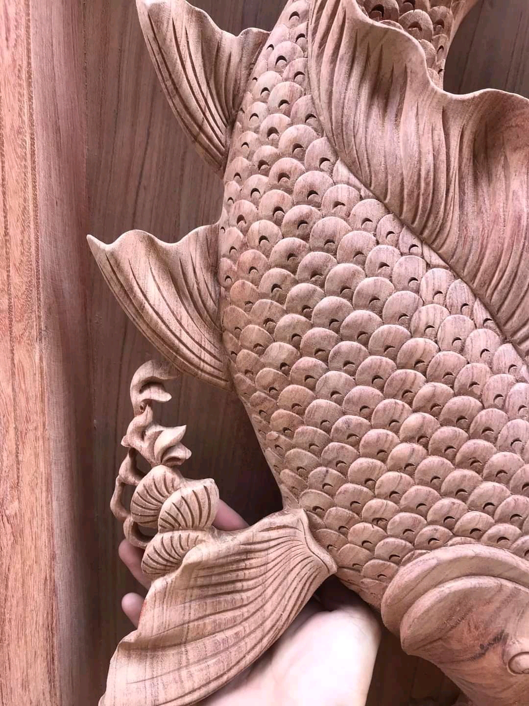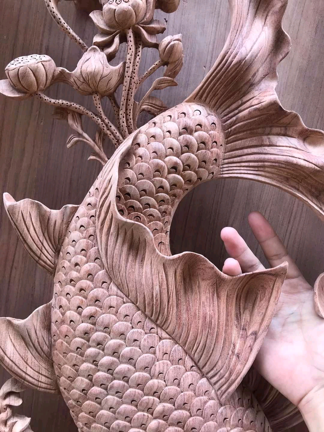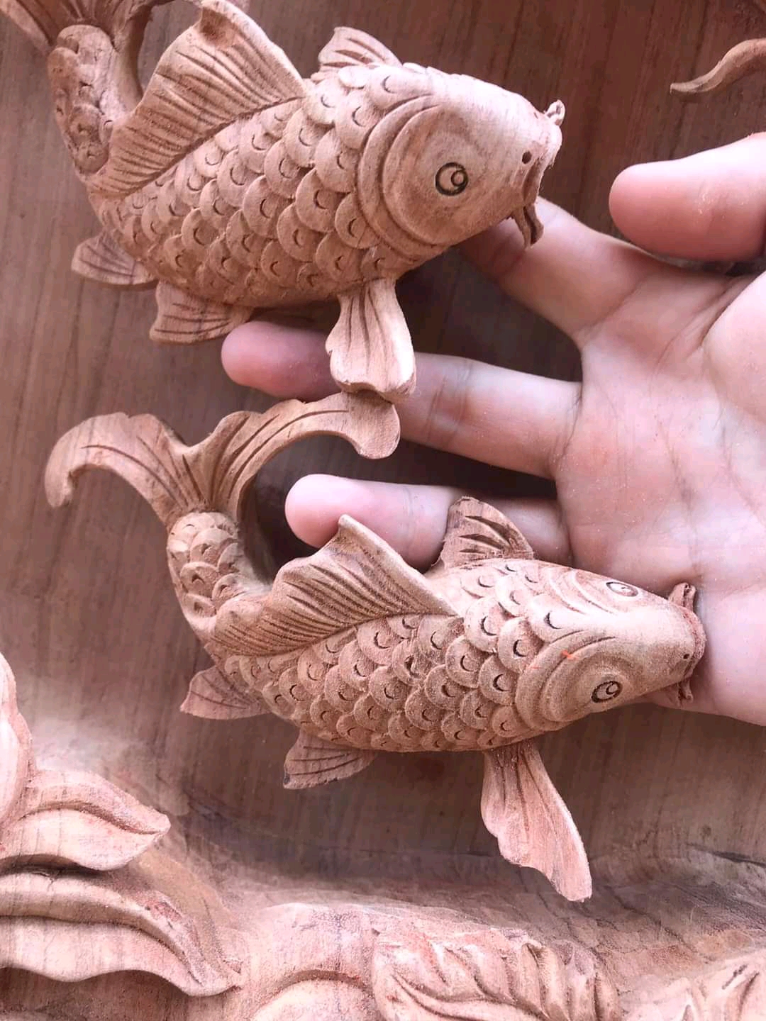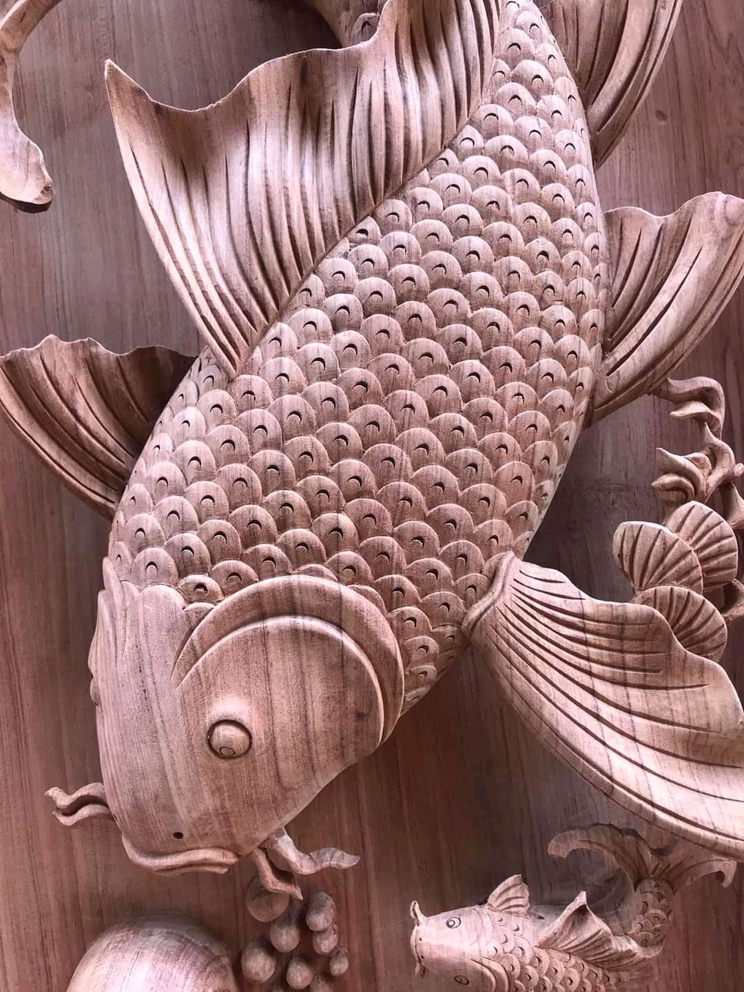 Tranh gỗ hương đục nổi mạ vàng - CẶP CÁ CHÉP -LÝ NGƯ VỌNG NGUYỆT Chất liệu gỗ hương liền khổi đục nổi 5D kênh bong , cực tinh xảo, mạ vàng sơn pu cao