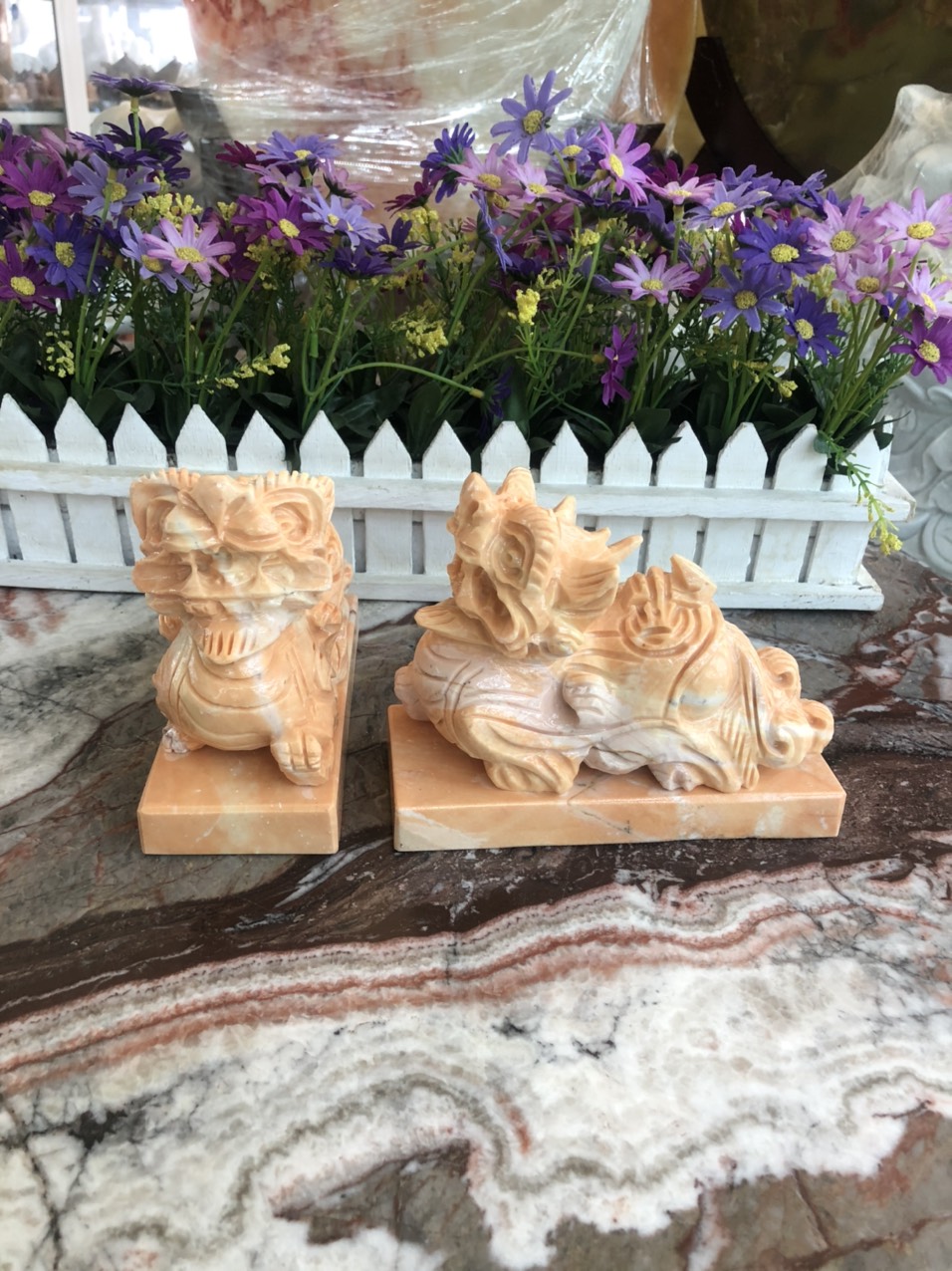 Hợp mệnh Thổ - Kim Chất liệu: Đá cẩm thạch vàng cà rốt Kích thước: Dài 15 cm X Rộng 6 cm x Cao 12,5 cm Khối lượng: 3,2 kg / cặp
