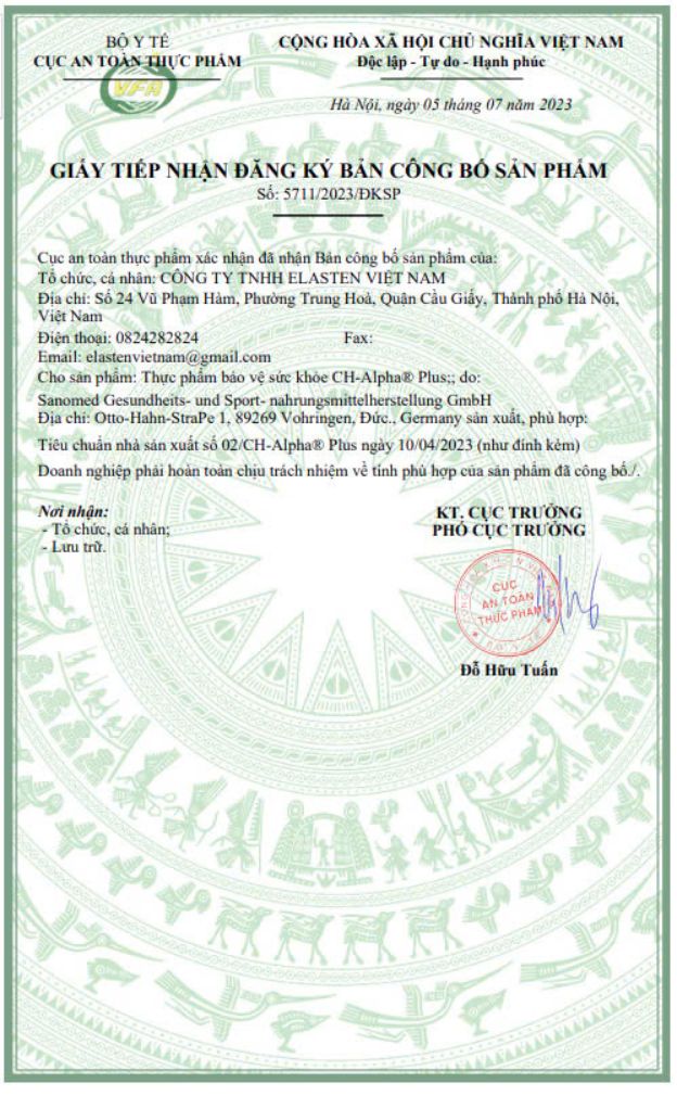 Đã được cấp Giấy tiếp nhận đăng ký bản công bố sản phẩm và Giấy xác nhận nội dung quảng cáo bởi Cục An Toàn Thực Phẩm – Bộ Y Tế Việt Nam (số công bố: 5711/2023/ĐKSP). Dạng uống tiện lợi – hấp thu nhanh