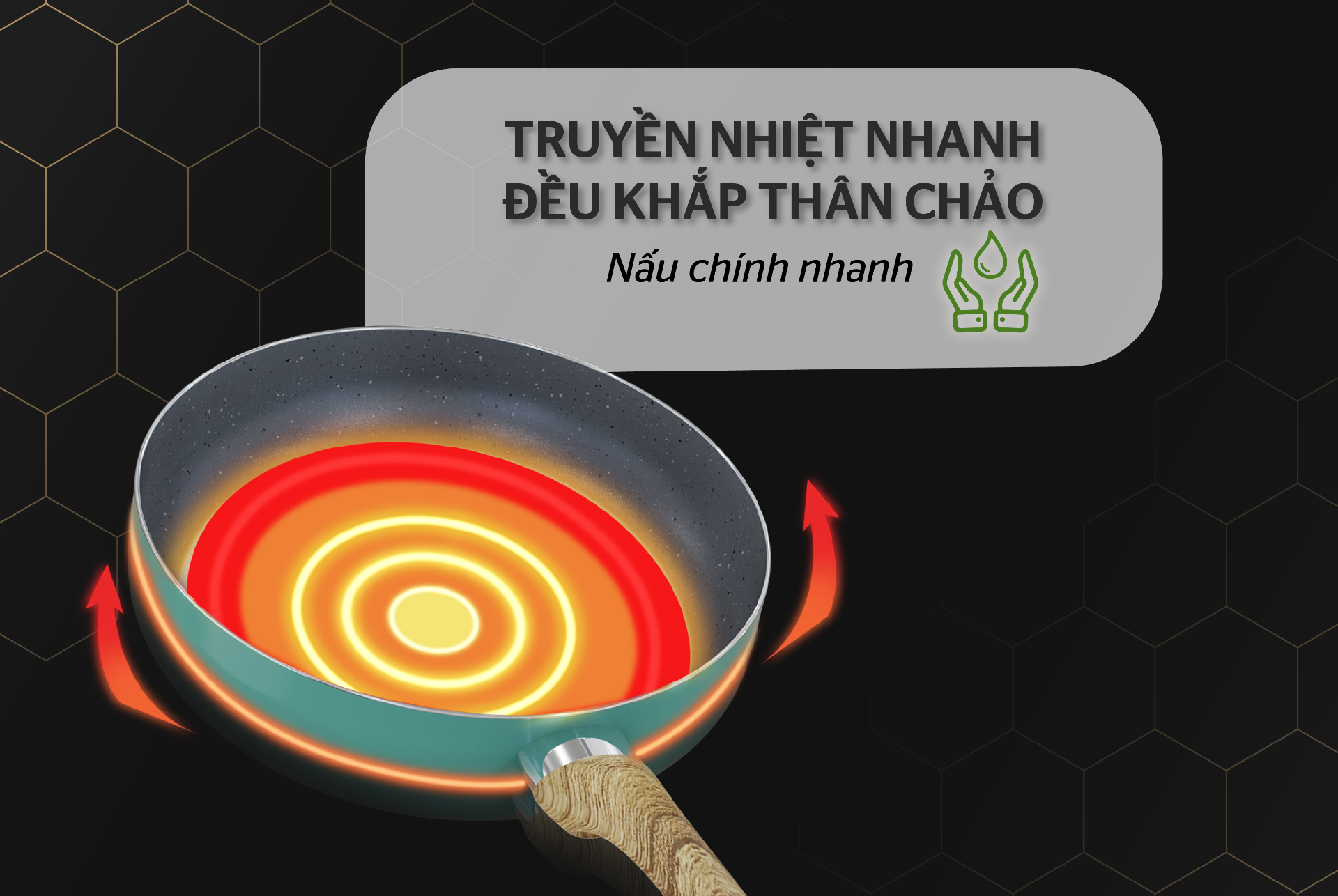 Thân chảo được làm từ nhôm hợp kim A3003 có khả năng truyền nhiệt nhanh, tản nhiệt đều. Khả năng tản nhiệt đều quanh chảo giữ nhiệt độ một cách ổn định giúp nấu thực phẩm chín đều.