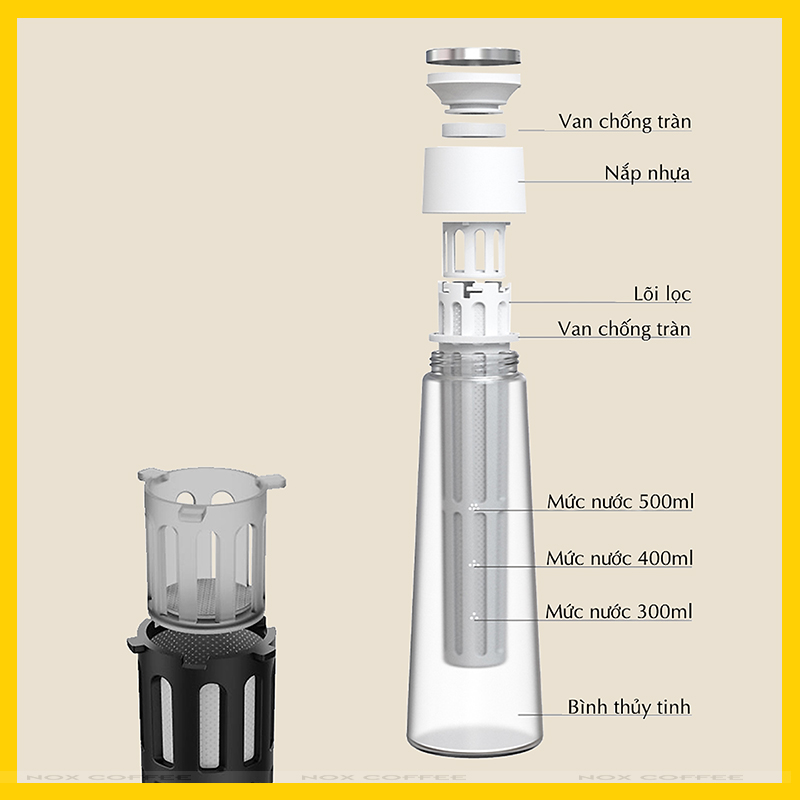 Bình được làm từ thuỷ tinh chất lượng cao, trên thân có in mức vạch đo giúp dễ dàng hơn trong việc kiểm soát tỷ lệ. Điểm nối bậc của bình là được tích hợp van chống tràn silicone hai lớp, ngoài việc tạo kín khí ngăn chặn sự xâm nhập từ môi trường bên ngoại thì bình dù trong tư thế đứng hay nằm cũng không bị đổ nước ra ngoài. Ngoài ra với thiết kế lõi lọc dài đến tận đáy bình nên bạn có thể dễ dàng ủ cold brew với lượng cà phê ít chỉ từ 30g