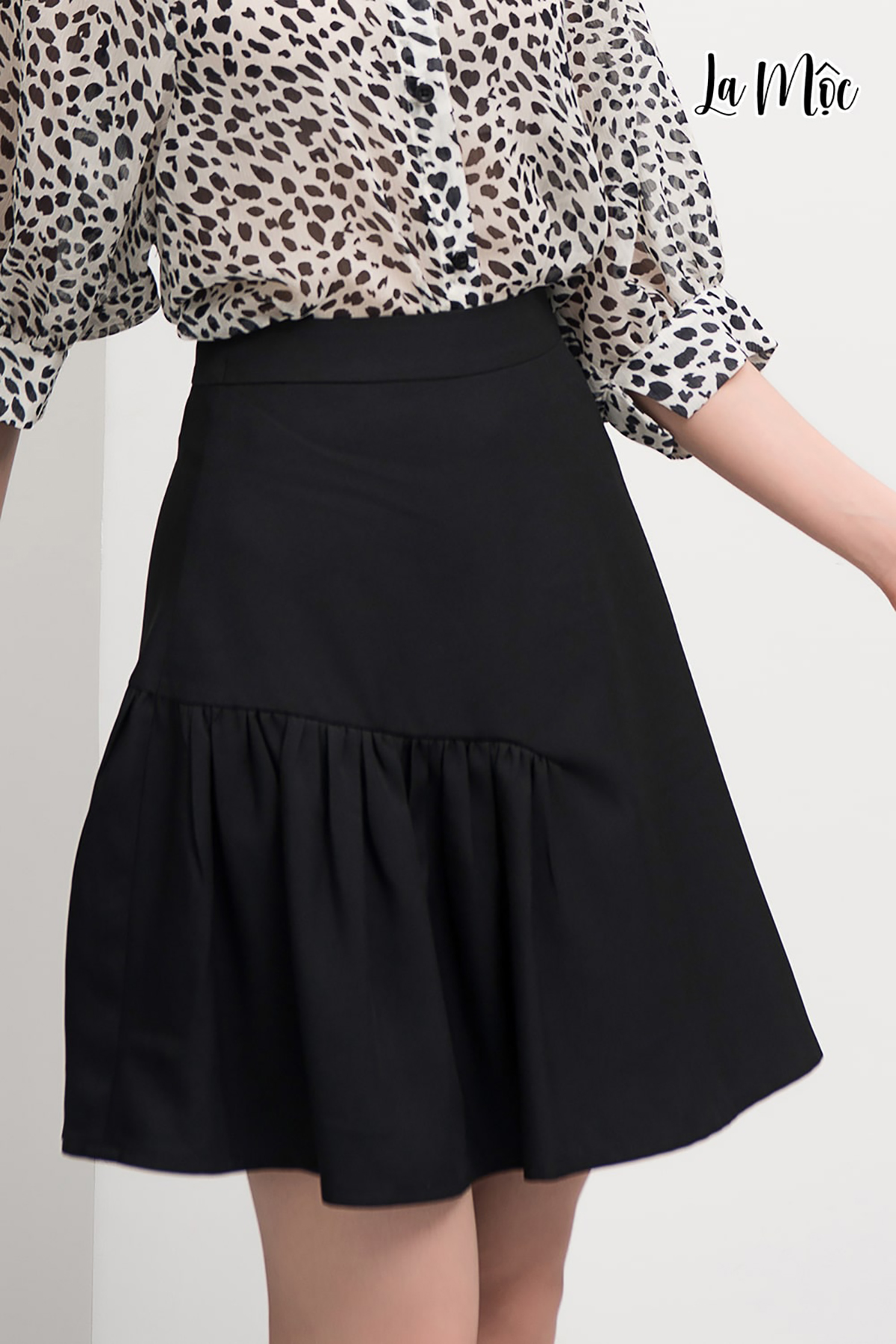 Váy đen nhún La Mộc với chất liệu xoa lụa Korea tạo cảm giác mềm mại. Thiết kế nhún phần hông trước và sau góp phần tôn dáng của nàng. Thiết kế dành riêng cho