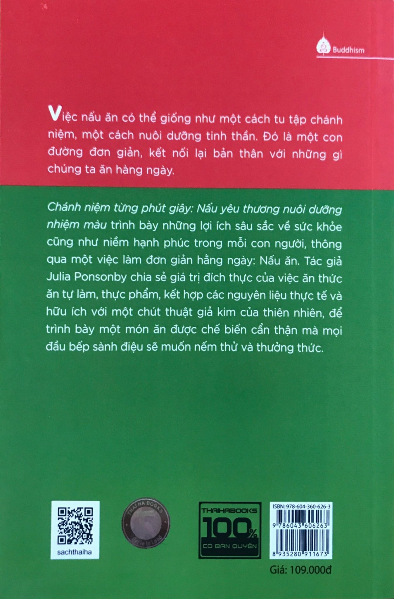 Cuốn sách nhẹ nhàng này sẽ giúp bạn hạnh phúc hơn ngay cả khi bạn đang nấu nướng. Khi thay đổi góc nhìn, tâm thế của chúng ta cũng sẽ thay đổi theo. Đây là cuốn sách nằm trong bộ “Chánh niệm từng phút giây”. Cuốn sách gợi mở những suy nghĩ mới về nấu ăn – một trong những hoạt động thú vị nhất mà chúng ta thực hiện mỗi ngày – như một cách tiếp cận có “chánh niệm” hơn với cuộc sống.