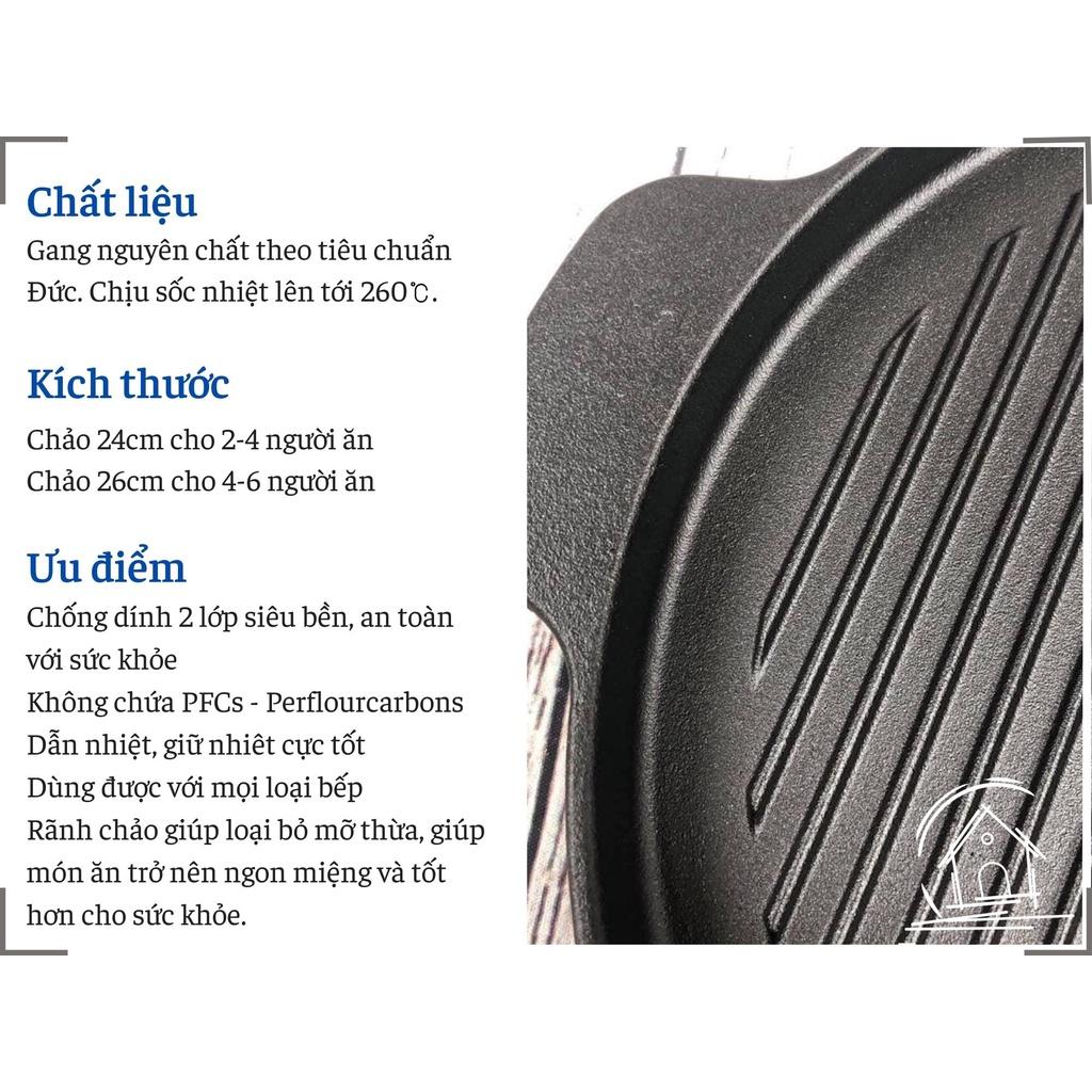 Thách thức mọi loại bếp, mọi loại thịt - khỏi cần dầu mỡ, bơ Chất liệu: Gang chuẩn Đức Kích thước 24cm & 26 cm, nặng 2.2 kg Chảo nướng bằng gang, dùng trên mọi