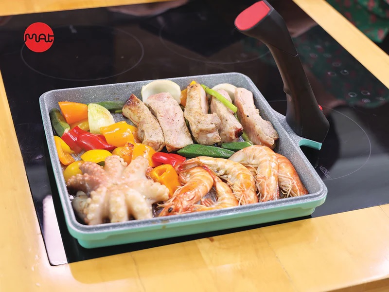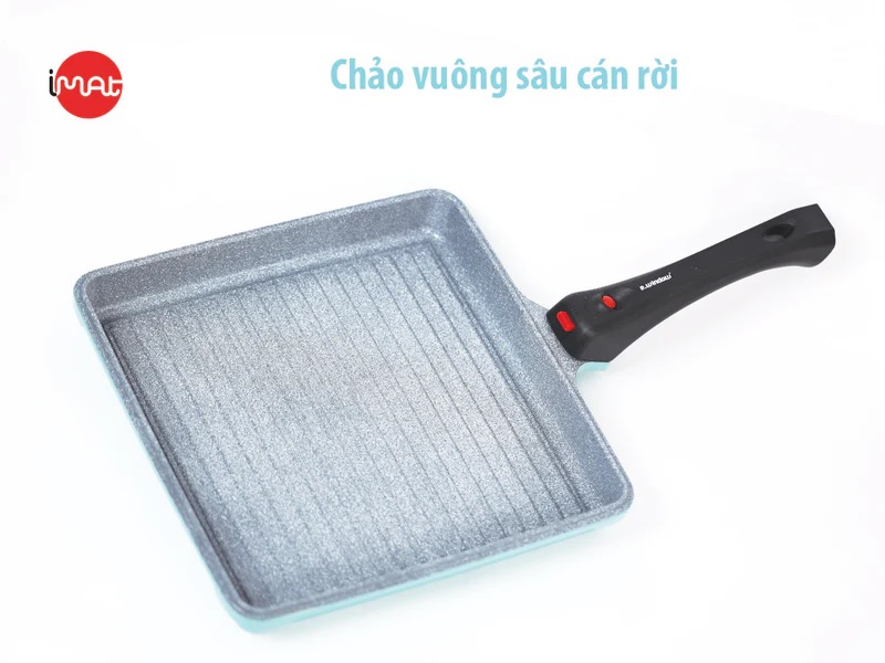 Chảo vuông, lòng rộng tới 28cm. Bằng nhôm đúc liền khối phủ chống dính bằng gốm an toàn. Cán tháo rời nên dùng đa năng: trong lò nướng, trong tủ lạnh, trong máy rửa chén. Dùng để chiên, nướng mọi thực phẩm với số lượng nhiều. Nấu được trên bếp Từ, gas, điện, Hồng ngoại...