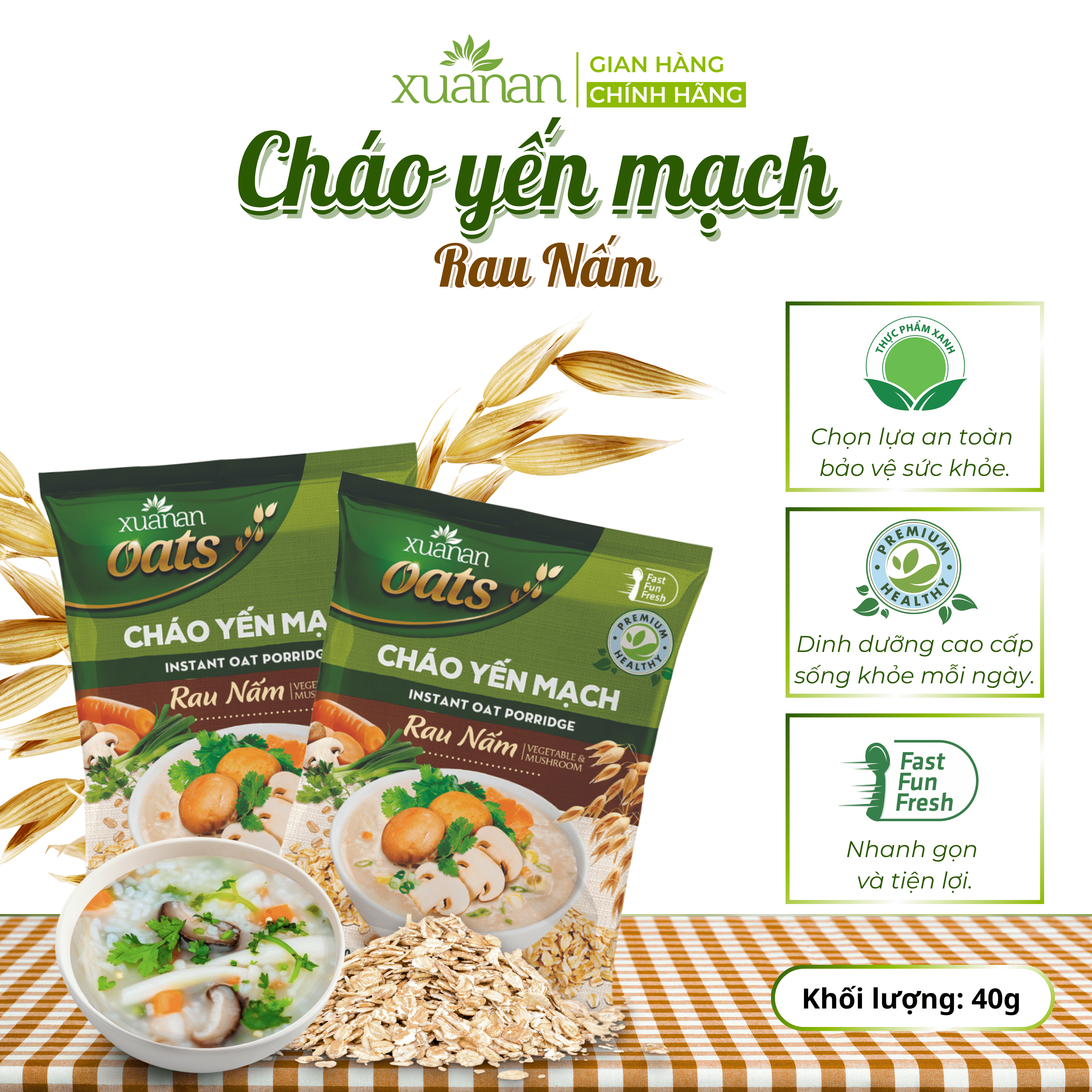 Combo 6 Gói Cháo Yến Mạch Rau Nấm Gói 40G [chay dùng được] Cháo Yến Mạch rau nấm giàu năng lượng và dưỡng chất từ thực vật, thơm ngon không dầu mỡ. Nấm và các loại rau củ được sấy theo công nghệ sấy thăng hoa, vẫn giữ được đầy đủ Vitamin và hương vị tự nhiên. Giá trị dinh dưỡng cho 1 gói cháo 40g Chất đạm g ≥ 4.00 Chất xơ g ≥ 2.10 Năng lượng Kcal ≥ 120 Chất béo g ≥ 2.00 Carbohydrate g ≥ 21.80 Đối tượng sử dụng: Trẻ em trên 36 tháng tuổi và người lớn. Quy cách đóng gói: 40g/ gói Thành phần: Gói cháo yến mạch nguyên chất (60%), phôi cháo gạo. Gói rau củ: nấm đông cô sấy thăng hoa (2%); cà rốt, paro, ngò rí sấy thăng hoa. Gói soup bột: hạt nêm nấm hương và hạt sen, muối iốt, đường, bột tiêu, maltodextrin, bột gia vị, chất chống đông vón (551), hương tổng hợp dùng cho thực phẩm. Hướng dẫn sử dụng: Cho gói cháo, gói soup bột và gói rau củ vào tô. Chế nước vừa đun sôi vào tô (khoảng 350ml) Đậy kín tô để trong 3 phút. Mở nắp tô, trộn đều là dùng được ngay.