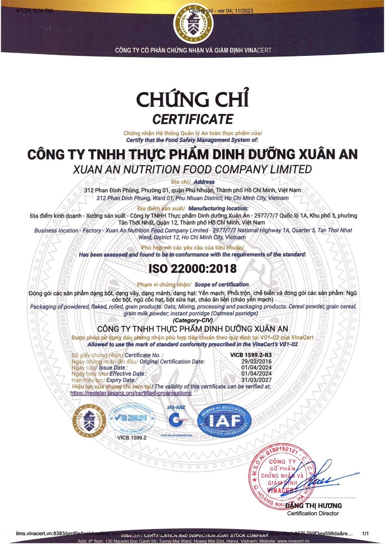 - Đậy kín tô để trong 3 phút. Mở nắp tô, trộn đều là dùng được ngay. Thông tin cảnh báo: Không sử dụng khi hết hạn ghi trên bao bì hoặc có dấu hiệu bất thường như mốc, hay có côn trùng xâm nhập vào bao bì. Quy cách đóng gói: 40g/ gói – 30 gói/ thùng. Sản phẩm của: Công ty TNHH Thực Phẩm Dinh Dưỡng Xuân An