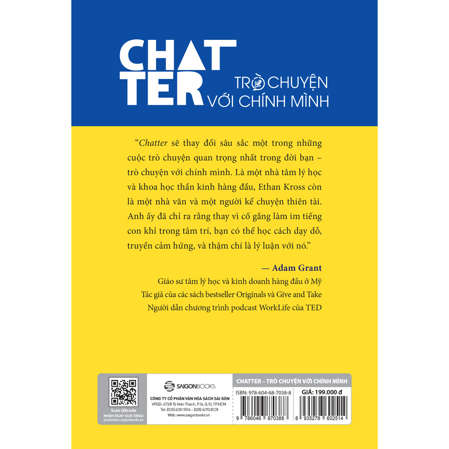 Chatter - Trò chuyện với chính mình là sự kết tinh của những nghiên cứu khoa học mới nhất về bộ não và tâm trí con người. Trong Chatter - Trò chuyện với chính mình, tác giả Ethan Kross đã khéo léo hệ thống hóa những tri thức khoa học đó và minh họa chúng bằng những câu chuyện hết sức thú vị khiến ta có cảm tưởng mình đang được xem những bộ phim bom tấn của Hollywood. Không dừng lại đó, tác giả còn chắt lọc ra những phương pháp hết sức cụ thể để ta có thể ứng dụng một cách dễ dàng vào đời sống hằng ngày của mình.