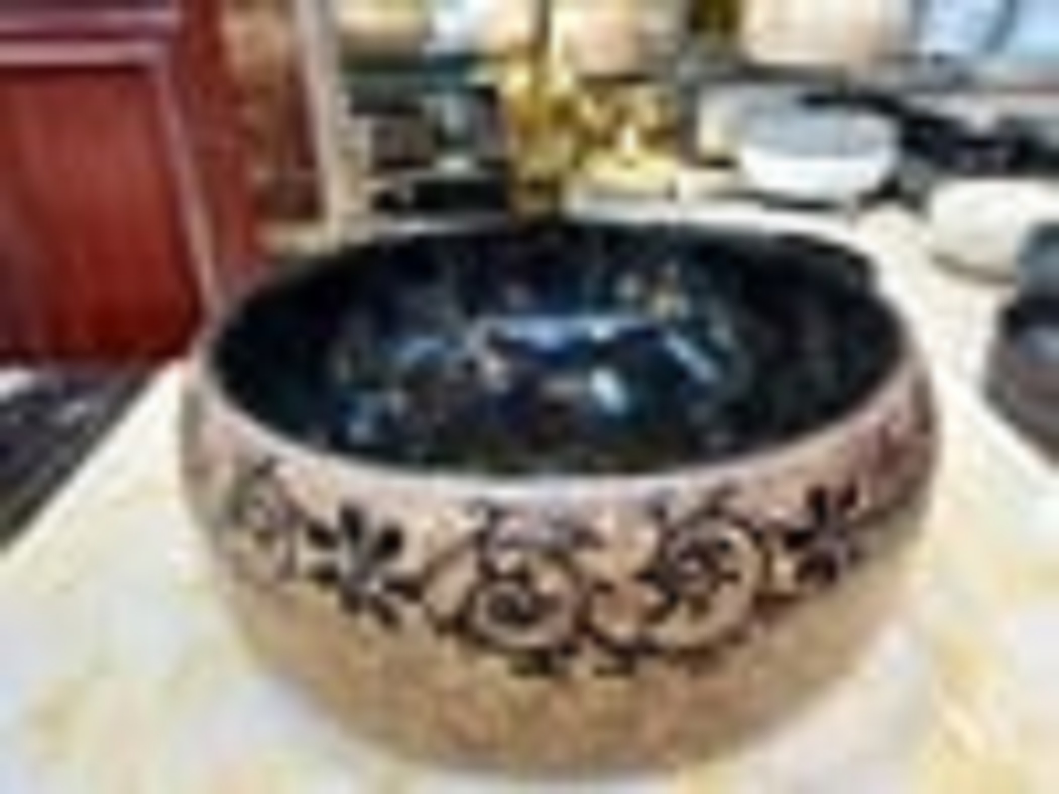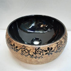 Chậu lavabo đặt bàn TRÒN, ĐEN GROVES GLV8130 (410x410x140) Màu sắc: Đen vàng Tráng men công nghệ cao Chống bám bẩn, lau rửa dễ dàng Chất liệu sứ siêu bền,bảo hành lớp men lên đến 10 năm tại nhà Kích thước: 40x40x15mm