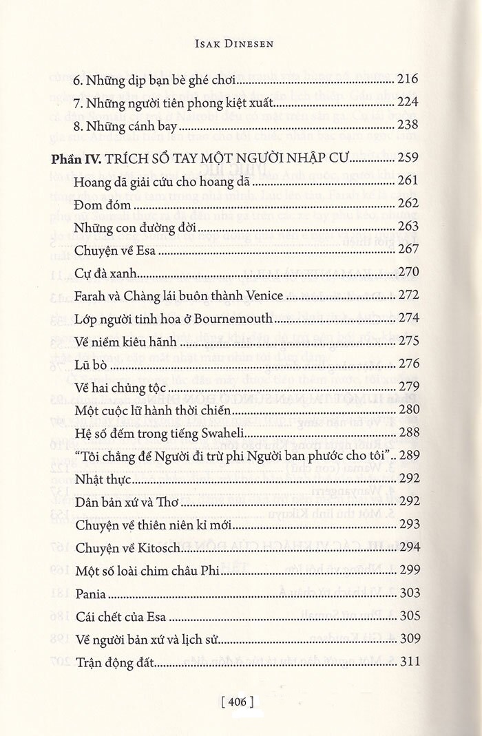 Châu Phi nghìn trùng – tác phẩm ra đời từ những trải nghiệm cá nhân của một con người, nhưng lại mở cho chúng ta cánh cửa tới châu Phi rộng lớn: Có thiên nhiên hoang dã, khoáng đạt, trao tặng nhiều song lấy đi cũng cực kì tàn nhẫn; có con người “nguyên sơ” lắm lúc đến mức khôi hài và cũng thật đáng yêu. Qua cuốn hồi ức, châu Phi hiện lên lạ lùng trong mối tương giao giữa cái bản địa và thực dân da trắng, từ góc nhìn khác biệt, không khinh khi, xa cách mà ẩn chứa tình yêu.