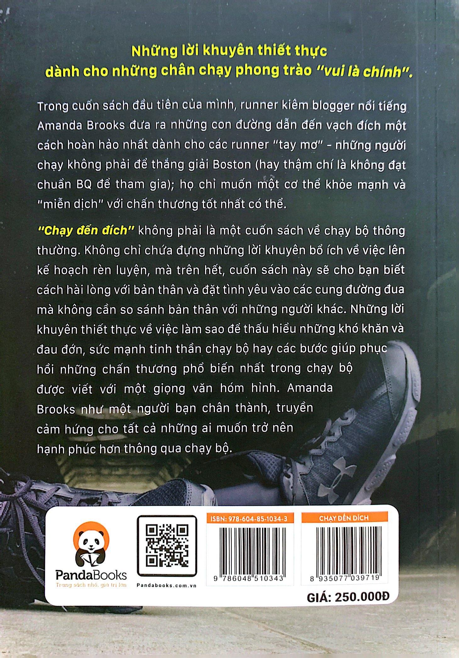 “Chạy đến đích” không phải là một cuốn sách về chạy bộ thông thường. Không chỉ chứa đựng những lời khuyên bổ ích về việc lên kế hoạch rèn luyện, mà trên hết, cuốn sách này sẽ cho bạn biết cách hài lòng với bản thân và đặt tình yêu vào các cung đường đua mà không cần so sánh bản thân với những người khác. Những lời khuyên thiết thực về việc làm sao để thấu hiểu những khó khăn và đau đớn, sức mạnh tinh thần chạy bộ hay các bước giúp phục hồi những chấn thương phổ biến nhất trong chạy bộ được viết với một giọng văn hóm hỉnh. Amanda Brooks như một người bạn chân thành, truyền cảm hứng cho tất cả những ai muốn trở nên hạnh phúc hơn thông qua chạy bộ.