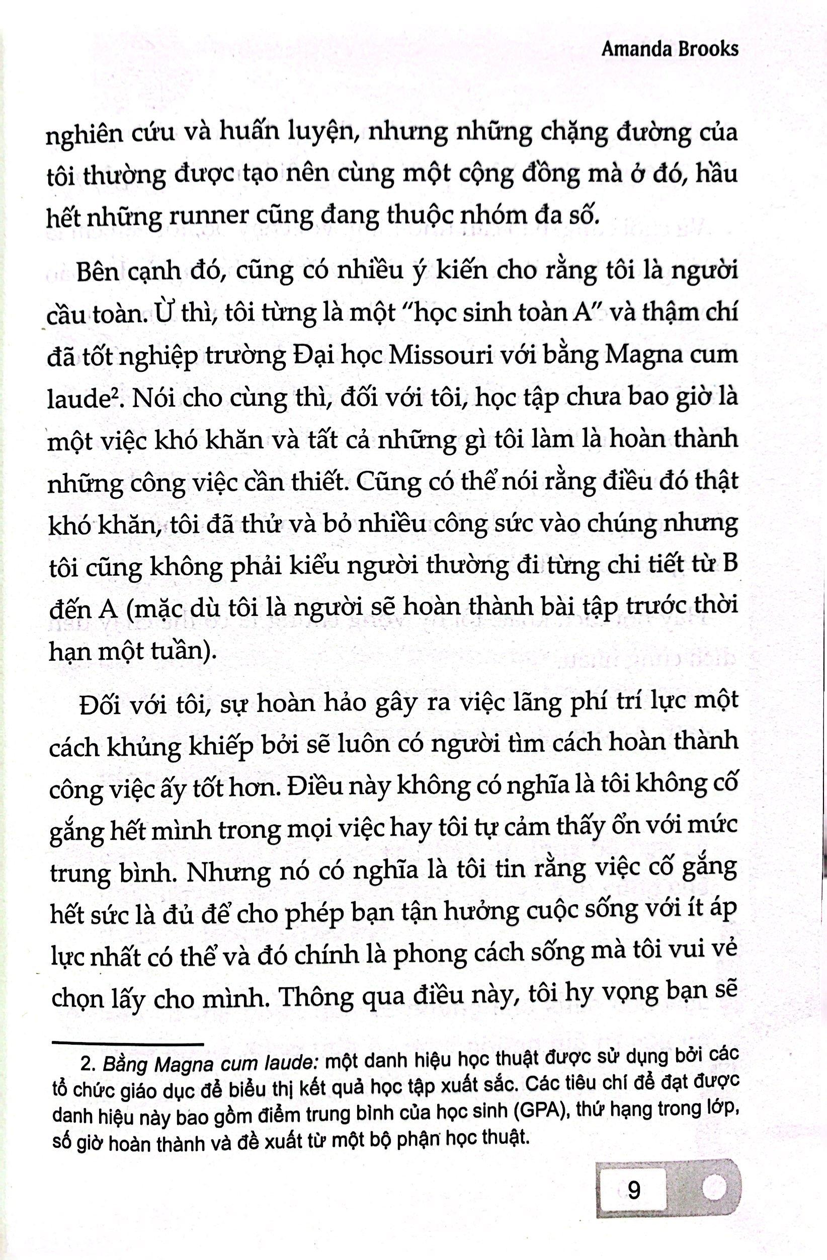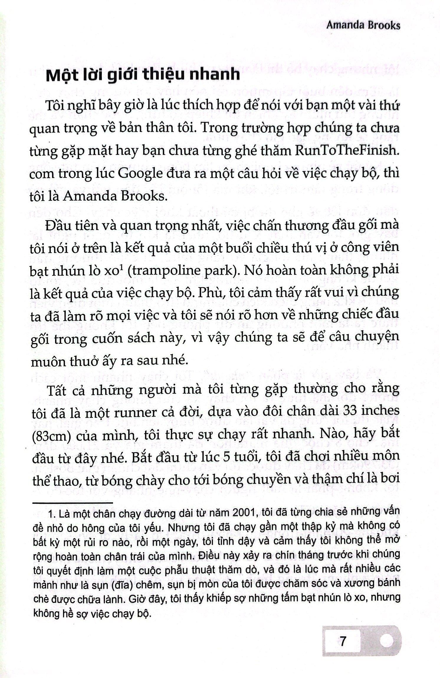Trong cuốn sách đầu tiên của m.ình, runner kiêm blogger nổi tiếng Amanda Brooks đưa ra những con đường dẫn đến vạch đích một cách hoàn hảo nhất dành cho các runner “tay mơ” – những người chạy không phải để thắng giải Boston (hay thậm chí là không đạt chuẩn BQ để tham gia); họ chỉ muốn một cơ thể khỏe mạnh và “miễn dịch” với chấn thương tốt nhất có thể.