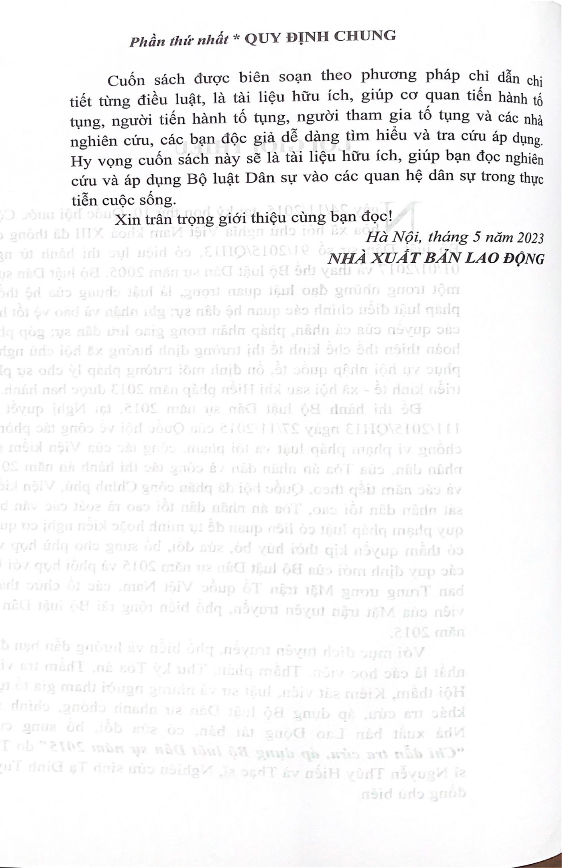 Hy vọng cuốn sách này sẽ là tài liệu hữu ích, giúp bạn đọc nghiên cứu và áp dụng Bộ luật Dân sự vào các quan hệ dân sự trong thực tiễn cuộc sống.
