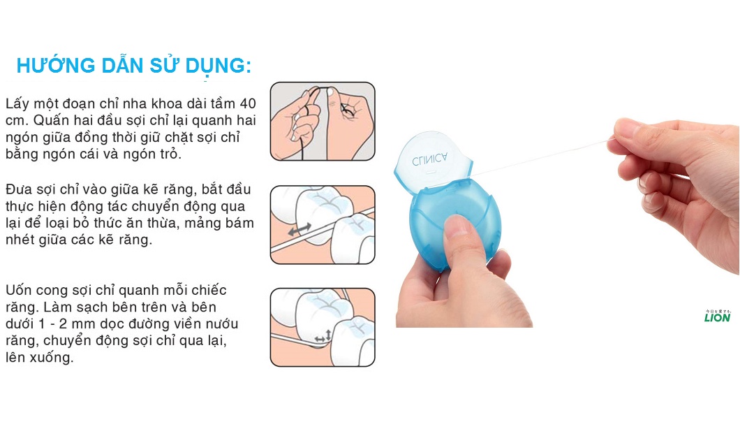 CHỈ NHA KHOA LIWORLDCO (NEW) Thành phần: Nylon, Pebax, Microcrystalline, Wax Công dụng: Làm sạch mảng bám và thức ăn trong kẻ răng Hướng dẫn sử dụng: Lấy một đoạn chỉ dài khoảng 30-40cm, cuộn 2 đầu chỉ