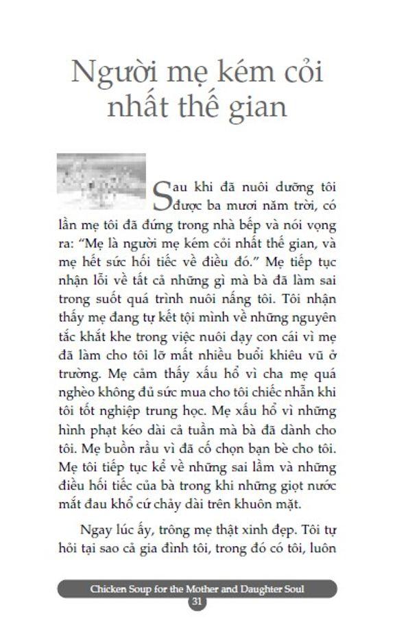 Những trang sách trong Chicken Soup for the Mother and Daughter Soul sẽ giúp bạn tìm được những phút giây đồng cảm trong tình yêu thương trìu mến giữa mẹ và con gái, giúp bạn tìm về ký ức thân thương ngày xưa để suy ngẫm về tất cả những điều mà Mẹ đã làm, đã hy sinh cho các con và cả về những lỗi lầm, suy tư trăn trở của chúng ta - những người con gái đối với mẹ. Chicken Soup for the Mother and Daughter Soul được trình bày dưới dạng song ngữ để giúp bạn đọc có thể cảm nhận trọn vẹn được ý nghĩa câu chuyện bằng cả hai ngôn ngữ. Quyển sách này không chỉ dành riêng cho những người phụ nữ - những người vừa là người con, vừa là người mẹ – mà còn dành cho tất cả những ai hiểu và yêu thương phụ nữ, bởi trái tim của họ sẽ cảm nhận được những câu chuyện về tình yêu thương, sự động viên, nỗi mất mát, sự sum họp, hy sinh, thủy chung, những quan tâm bình dị hàng ngày - tất cả những điều đó đã góp phần tạo nên quyển sách này.