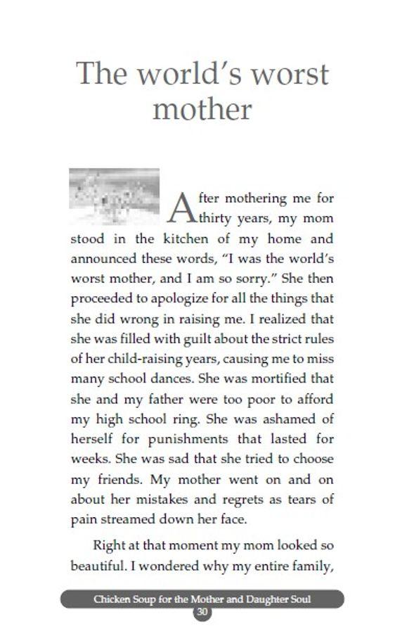 Làm mẹ không đơn thuần là một vai trò hay là kết quả tất yếu về mặt sinh học. Người làm mẹ không chỉ là người sinh ra và dưỡng dục những đứa con mà trách nhiệm cao cả của người mẹ ở việc dạy dỗ những đứa con gái bé bỏng của m.ình học cách yêu thương, học cách suy nghĩ sao cho quen với vai trò của một người phụ nữ. Làm mẹ là phải phục vụ, yêu thương, cảm thông, trân trọng và quan tâm đến các con của m.ình. Còn những cô con gái, họ nghĩ về mẹ của m.ình như thế nào và vai trò của họ đối với mẹ ra sao? Những câu chuyện trong Chicken Soup for the Mother and Daughter Soul sẽ giúp chúng ta hiểu được những giá trị tinh thần lớn lao của những cô con gái. Họ đã đi vào cuộc đời của người mẹ như một món quà quý giá mà tạo hóa đã ban tặng cho người mẹ. Những nụ cười hồn nhiên, những vòng tay yêu thương, quấn quýt của con trẻ có tác dụng nâng đỡ tinh thần, truyền sức mạnh và sưởi ấm tâm hồn những bà mẹ, giúp người mẹ sống tự tin và yêu đời hơn. Con gái còn cho những người mẹ thấy một thế giới rộng lớn hơn - đó là thế giới riêng của chúng, đồng thời giúp người mẹ thấy được chính họ với một cuộc đời mới, để cảm nhận được tình yêu thương của các con. Và trên hết là con cái cũng dành cho mẹ của m.ình tất cả tình yêu thương, sự kính trọng tựa như những gì họ đã nhận được từ mẹ.
