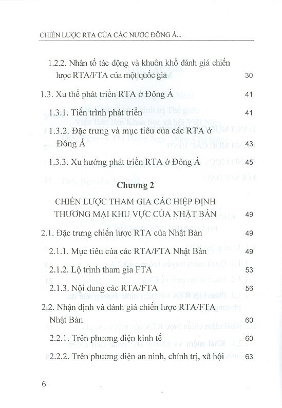 Trong xu hướng hình thành và phát triển RTA trên thế giới, Đông Á được đánh giá là khu vực tham gia và ủng hộ các hiệp định khu vực tích cực nhất. Mặc dù khởi động chậm hơn so với làn sóng RTA ở các quốc gia châu Mỹ, châu Âu và châu Phi, song Đông Á lại thể hiện sự bứt phá ngoạn mục của mình trong nỗ lực tham gia RTA. Theo nhận định của nhiều chuyên gia, mặc dù cùng hòa chung vào làn sóng RTA ở khu vực nhưng các quốc gia Đông Á lại có những chiến lược RTA khác nhau. Đối với Việt Nam, quan điểm hội nhập vào RTA là tự do hóa thương mại đạt được thông qua các hiệp định có ý nghĩa bổ sung cho những nỗ lực tự do hóa trong WTO trên phạm vi toàn cầu tuy nhiên, đến nay Việt Nam vẫn chưa có một chiến lược rõ ràng nào đối với quá trình hội nhập các hiệp ước. Xuất phát từ thực tế đó, năm 2018, Nhà xuất bản Khoa học xã hội xuất bản cuốn: “Chiến lược RTA của các nước Đông Á và kinh nghiệm cho Việt Nam” do Lê Thị Ái Lâm và Nguyễn Thị Hồng Nga đồng chủ biên. Qua việc tìm hiểu, phân tích và so sánh các chiến lược, chính sách RTA của các nước Đông Á (Nhật Bản, Hàn Quốc, Trung Quốc và Indonesia) để từ đó nhìn nhận những thách thức của Việt Nam trong thời gian tới đồng thời rút ra những bài học kinh nghiệm trong quá trình tham gia RTA của Việt Nam trong thời gian tới. Cuốn sách gồm 7 chương: