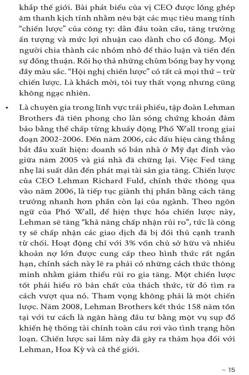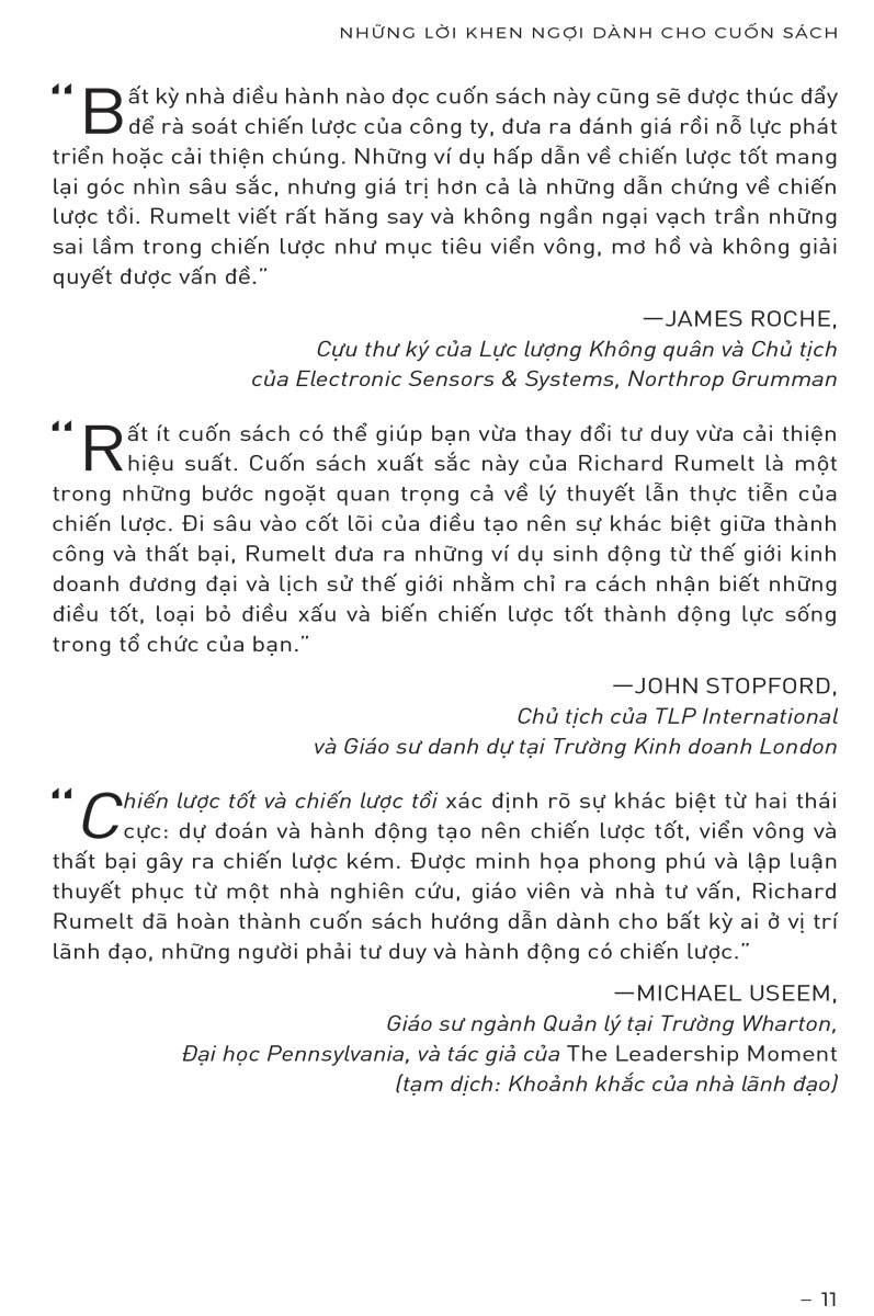 Khoảng cách giữa chiến lược tốt và mớ bòng bong của những thứ mà người ta gọi là “chiến lược” ngày càng lớn dần theo năm tháng. Cuốn sách này ra đời nhằm “thức tỉnh” chúng ta về sự khác biệt to lớn giữa chiến lược tốt và chiến lược tồi, đồng thời giúp các nhà lãnh đạo cải thiện khả năng xây dựng chiến lược tốt.