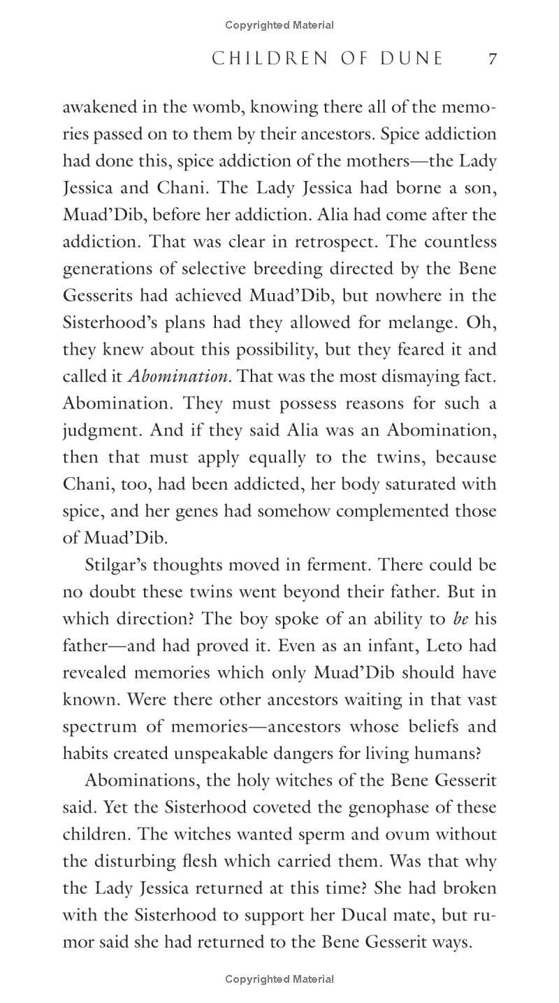 The Children of Dune are twin siblings Leto and Ghanima Atreides, whose father, the Emperor Paul Muad’Dib, disappeared in the desert wastelands of Arrakis nine years ago. Like their father, the twins possess supernormal abilities—making them valuable to their manipulative aunt Alia, who rules the Empire in the name of House Atreides.