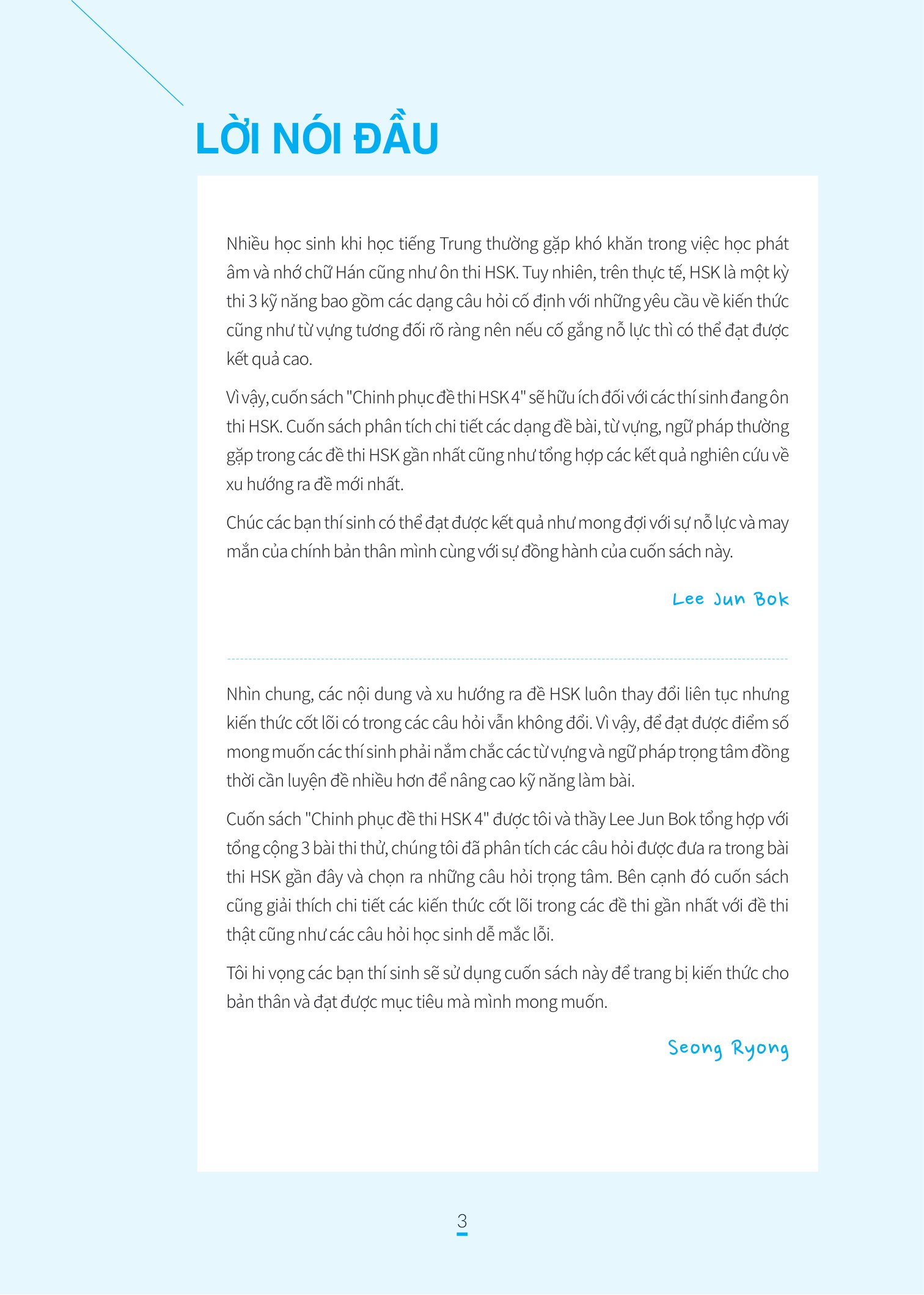Ở phần đầu sách sẽ giới thiệu về đề thi HSK 4 bao gồm đối tượng dự thi, cấu trúc bài thi và phân bổ thời gian, những lưu ý trong thời gian thi, tiêu chuẩn để đạt yêu cầu và cách viết phiếu trả lời HSK 4