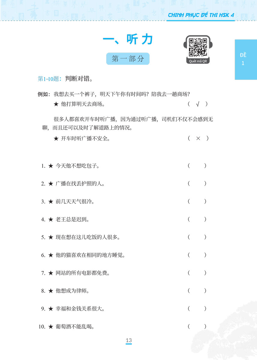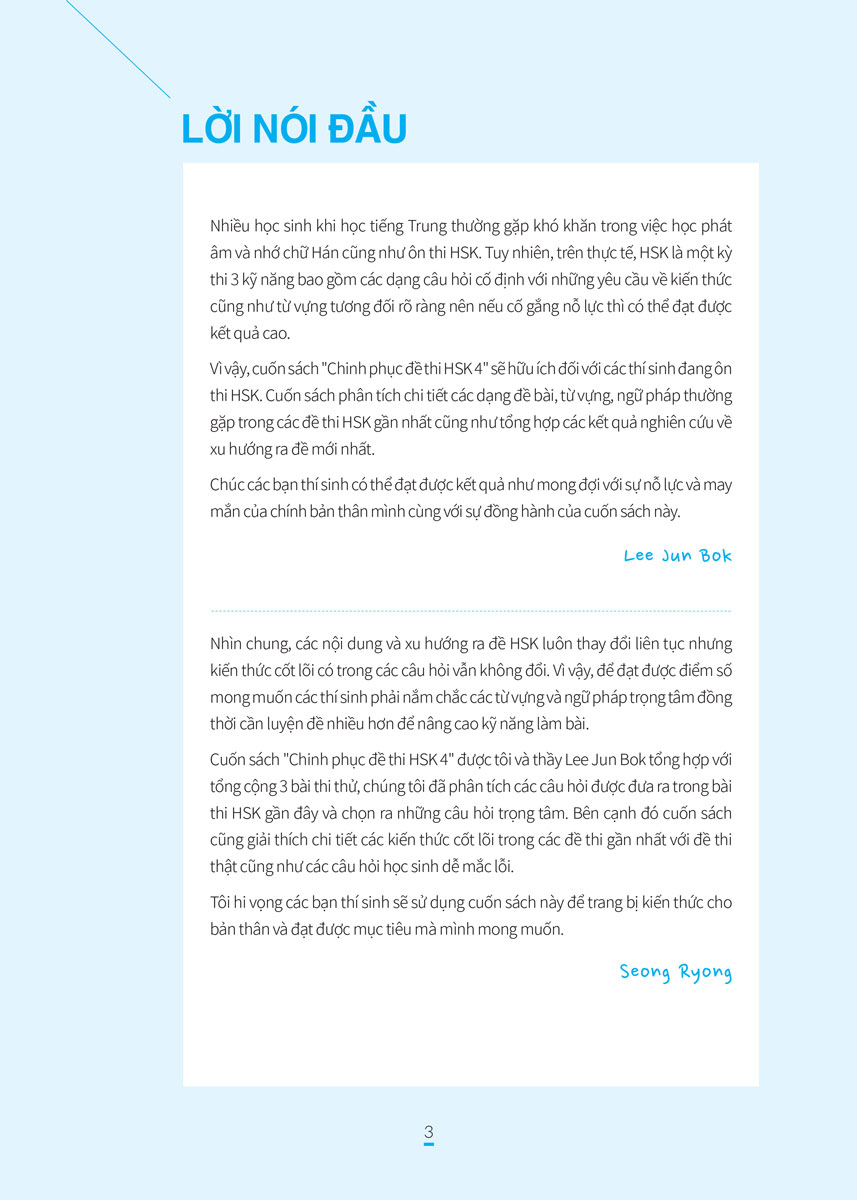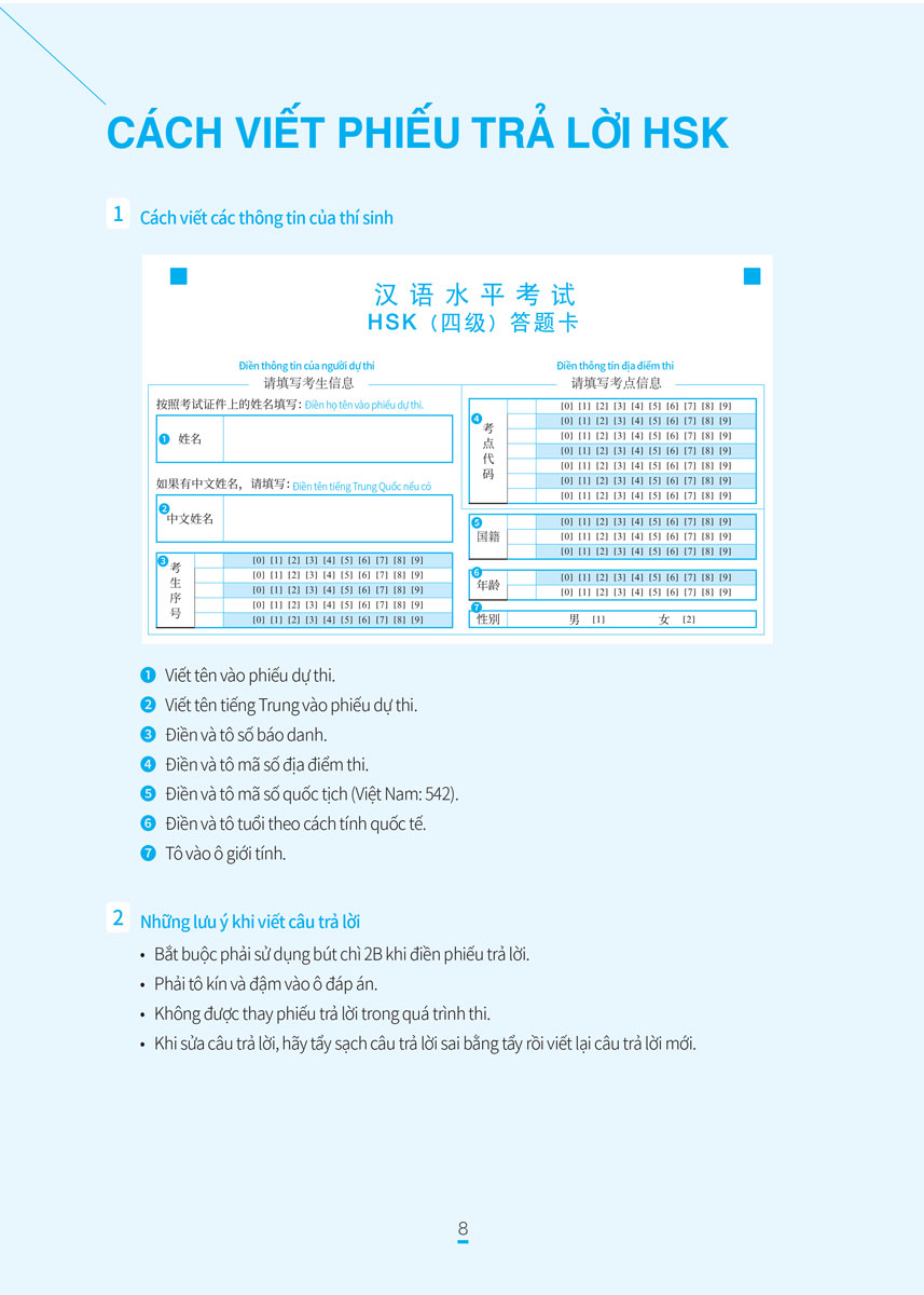 Ở phần đầu sách sẽ giới thiệu về đề thi HSK 4 bao gồm đối tượng dự thi, cấu trúc bài thi và phân bổ thời gian, những lưu ý trong thời gian thi, tiêu chuẩn để đạt yêu cầu và cách viết phiếu trả lời HSK 4