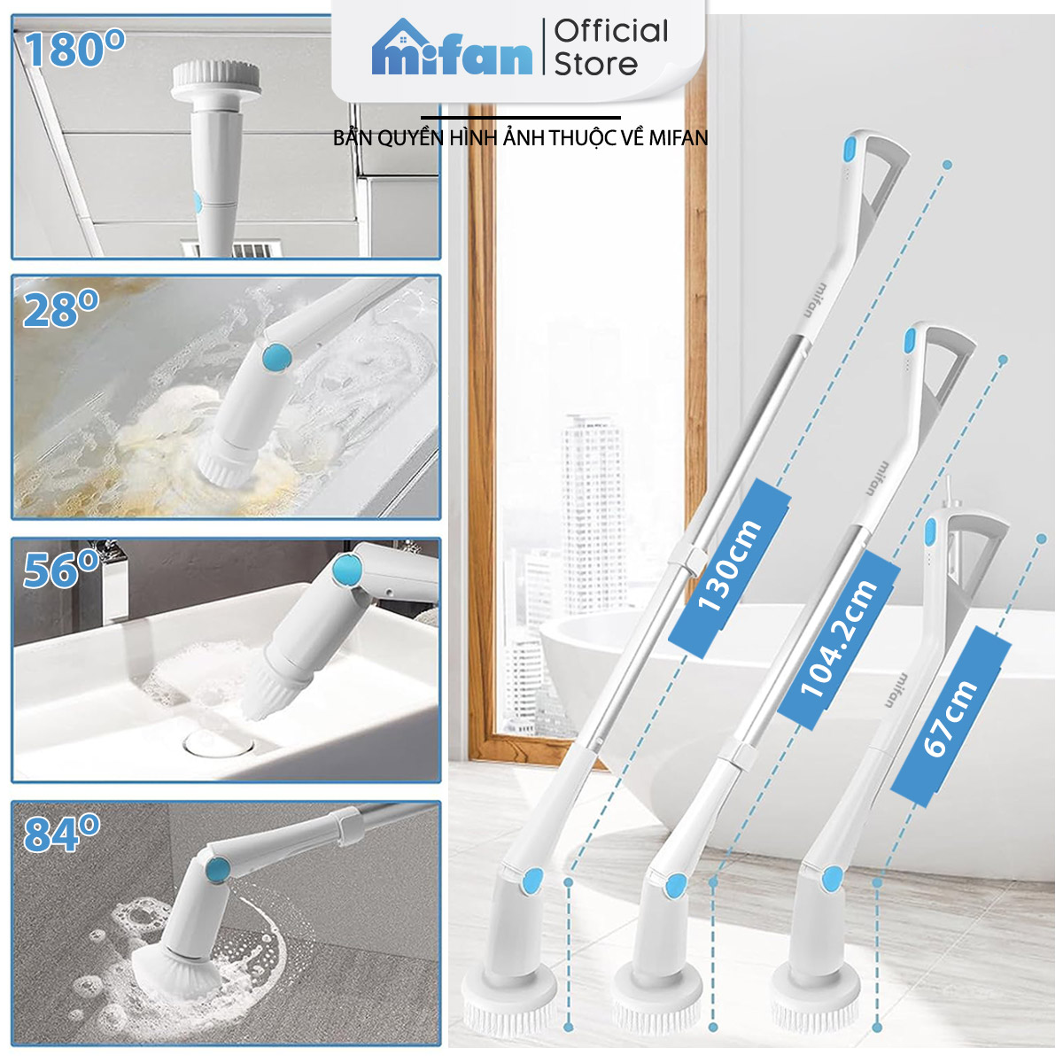 ĐIỀU CHỈNH ĐỘ DÀI VÀ GÓC QUAY: Có thể điều chỉnh độ dài tới 1M30 và góc quay rộng 84°, thuận tiện cho việc làm sạch ở các vị trí khó tiếp cận.