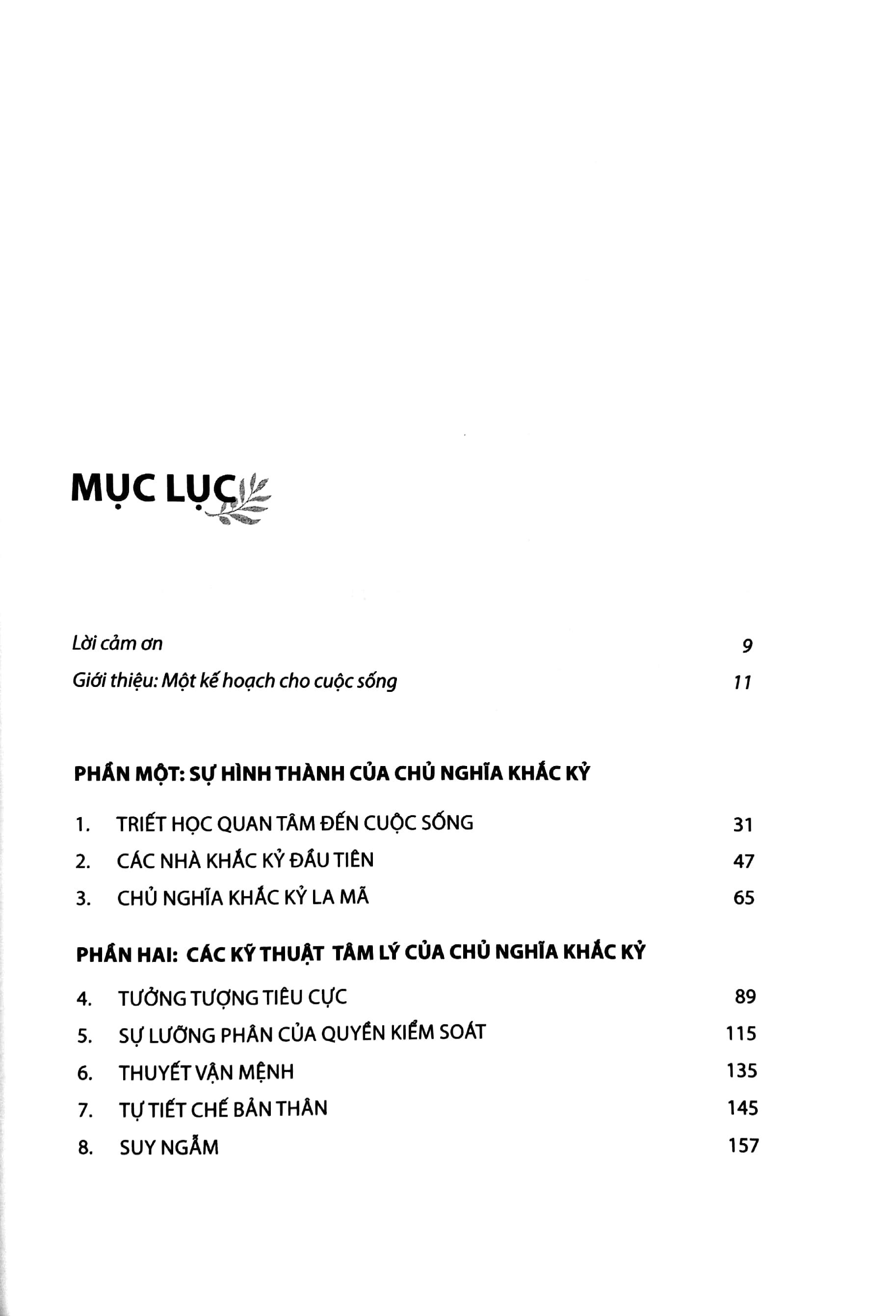Cuốn sách này dành cho những người đang tìm kiếm một triết lý sống. Trong các trang tiếp theo, tôi sẽ tập trung vào một triết lý mà tôi thấy hữu ích và tôi nghĩ rằng nhiều độc giả cũng sẽ thấy như vậy. Đó là triết lý của trường phái Khắc kỷ cổ đại. Tuy triết lý sống này đã lâu đời nhưng ngày nay nó xứng đáng nhận được sự chú ý của bất kỳ cá nhân nào mong muốn có được một cuộc sống vừa ý nghĩa vừa trọn vẹn – những người mong muốn có được một cuộc sống tốt đẹp.
