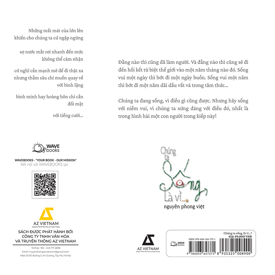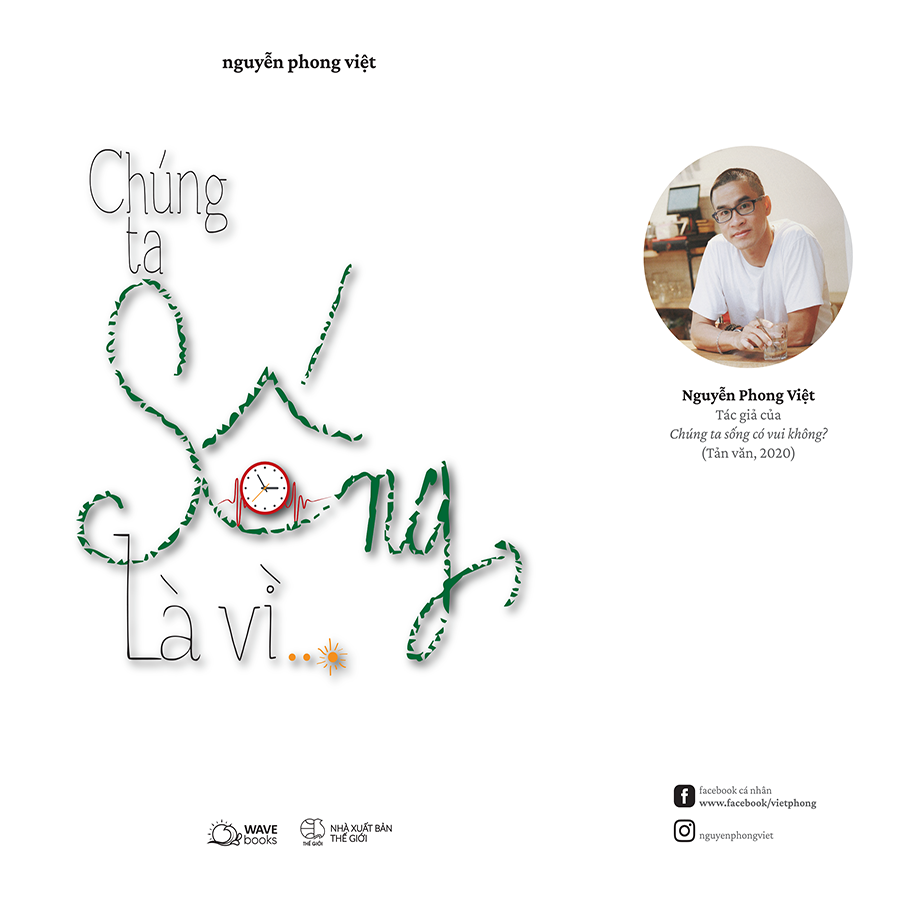 Sau cột mốc khép lại hành trình mười năm sáng tác thơ qua tập thơ Đã đi qua thương nhớ, ra mắt vào mùa Giáng sinh năm 2021, Nguyễn Phong Việt chính thức trở lại, nối tiếp sứ mệnh ngòi bút của mình dưới một hình thức khác, được thể hiện qua cuốn tản văn mới nhất Chúng ta sống, là vì…? Chúng ta sống, là vì…? tập hơn 43 mẩu chuyện dài có, ngắn có, mang đậm dấu ấn và phong cách rất riêng mà Nguyễn Phong Việt đã ghi vào lòng độc giả của mình trong suốt những năm qua. Đó là những câu từ được viết ra bởi những chiêm nghiệm thực tế cộng hưởng với cảm xúc chân thành, mộc mạc của tác giả trước dòng chảy cuộc sống. Đó là những ký ức giản dị như món ăn tuổi thơ, những vấp váp trái tim đã trải qua trước khi cứng cáp hơn, và đó cũng có thể là tâm tư sau một năm đại dịch với nhiều mất mát, đổi thay. Cuốn sách này không quá lãng mạn như thơ, mà chứa nhiều góc cạnh hiện thực hơn. Độc giả sẽ bắt gặp hình ảnh bản thân ở đâu đó trong những trang sách bởi câu “Chúng ta sống, là vì…?” vốn là một câu tự vấn mà trong chuỗi ngày sống, lắm lúc chúng ta cũng tự đặt ra cho chính mình. Đáp án cho câu hỏi trên của mỗi người sẽ khác nhau, bởi chúng ta luôn có sự khác biệt. Những dẫu cuộc đời có thế nào, thì “quỹ thời gian của con người cũng chỉ có chừng đó, sao không chọn vui - cho chính mình - mà phải đi chọn những thứ khác…?”. Chúng ta sống, là vì…? sẽ là một món quà để độc giả gói ghém những gì đã xảy trong một năm, xoa dịu những góc còn gồ ghề và chuẩn bị tâm thế tích cực cho một năm mới. Sách được phát hành bởi thương hiệu sách Wavebooks với sứ mệnh trở thành người bạn đồng hành tin cậy cho quá trình phát triển kỹ năng và tâm hồn người Việt trẻ.