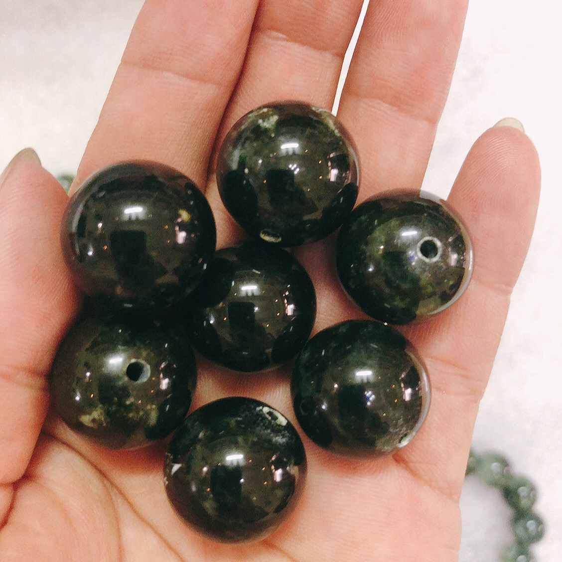 Chất liệu: đá ngọc serpentine 100% của Việt Nam Kích thước: Li hột là 17 li (1.7 cm) màu xanh lá đen bóng tinh khiết Dùng để đeo tay hoặc để lần tràng hạt khi