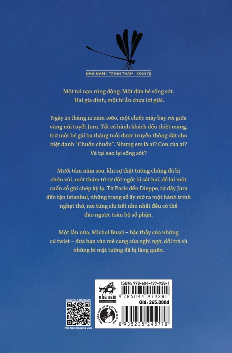 Ngày 23 tháng 12 năm 1980, một chiếc máy bay rơi giữa vùng núi tuyết Jura. Tất cả hành khách đều thiệt mạng, trừ một bé gái ba tháng tuổi được truyền thông đặt cho biệt danh “Chuồn chuồn”. Nhưng em là ai? Con của ai? Và tại sao lại sống sót? Mười tám năm sau, khi sự thật tưởng chừng đã bị chôn vùi, một thám tử tư đột ngột bị sát hại, để lại một cuốn sổ ghi chép kỳ lạ. Từ Paris đến Dieppe, từ dãy Jura đến tận Istanbul, những trang sổ ấy mở ra một hành trình nghẹt thở, nơi từng chi tiết nhỏ nhặt đều có thể đảo ngược toàn bộ số phận. Một lần nữa, Michel Bussi – bậc thầy của những cú twist – đưa bạn vào mê cung của nghi ngờ, dối trá và những bí mật tưởng đã bị lãng quên .