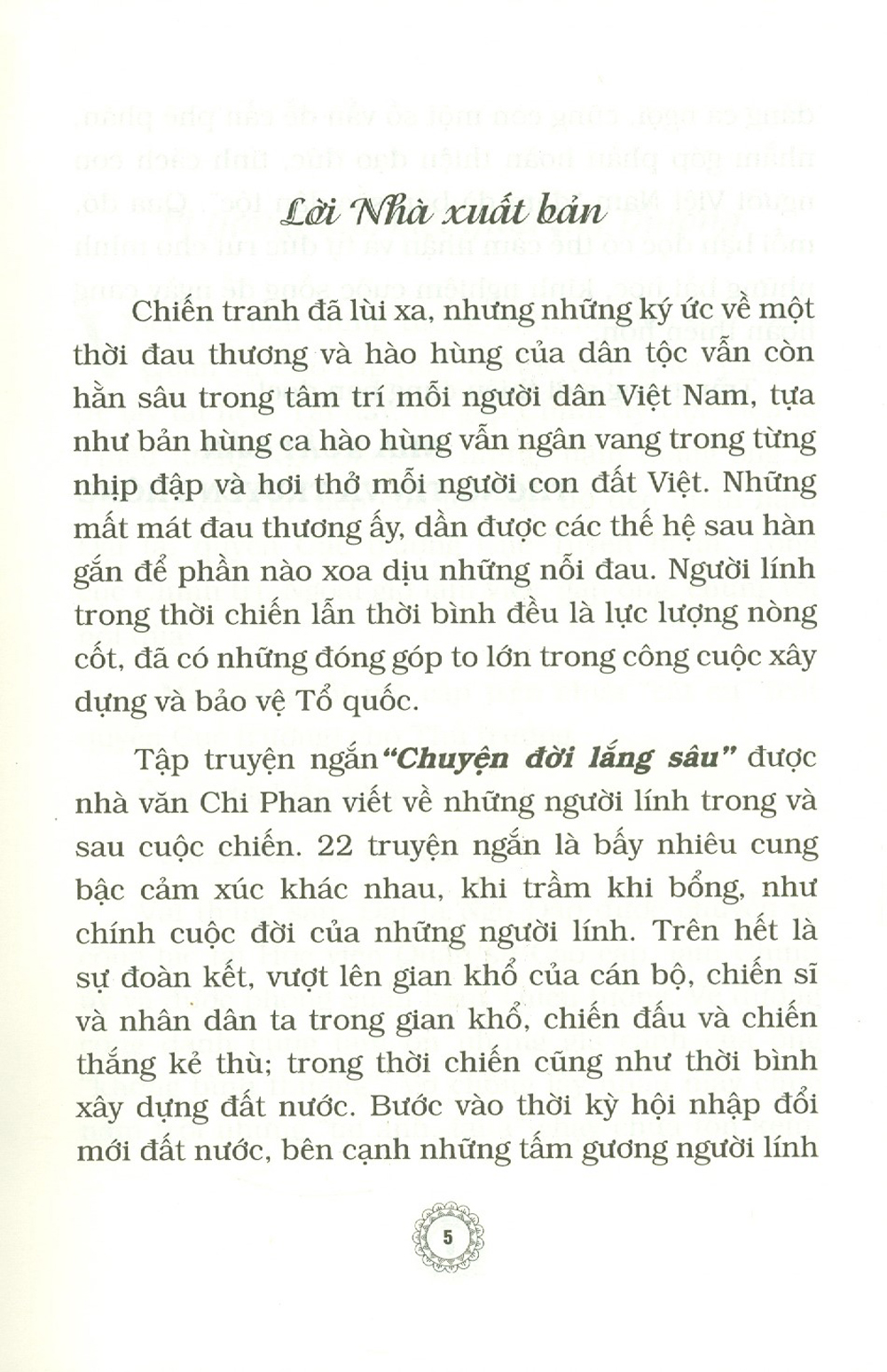 Tập truyện ngắn "Chuyện đời lắng sâu" được nhà văn Chi Phan viết về những người lính trong và sau cuộc chiến. 22 truyện ngắn là bấy nhiêu cung bậc cảm xúc khác nhau, khi trầm khi bổng, như chính cuộc đời của những người lính. Trên hết là sự đoàn kết, vượt lên gian khổ của cán bộ, chiến sĩ và nhân dân ta trong gian khổ, chiến đầu và chiến thắng kẻ thù; trong thời chiến cũng như thời bình xây dựng đất nước.