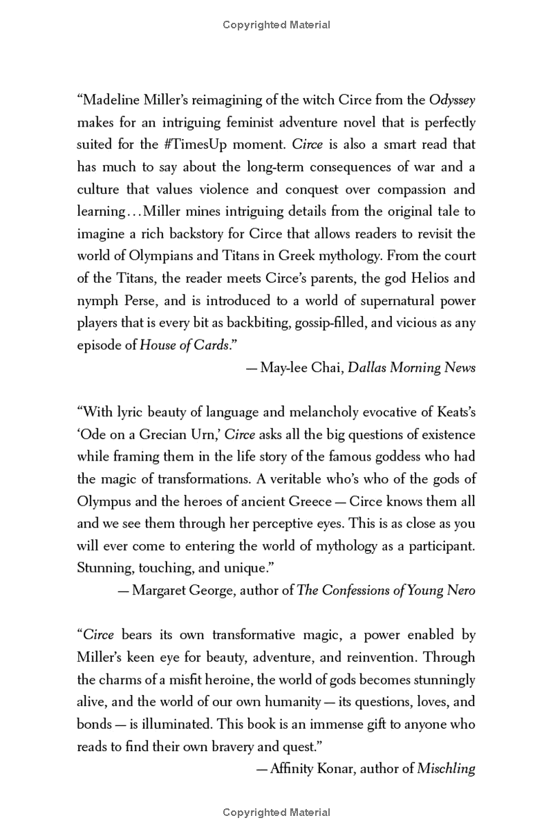 With unforgettably vivid characters, mesmerizing language, and page-turning suspense, Circe is a triumph of storytelling, an intoxicating epic of family rivalry, palace intrigue, love and loss, as well as a celebration of indomitable female strength in a man's world.