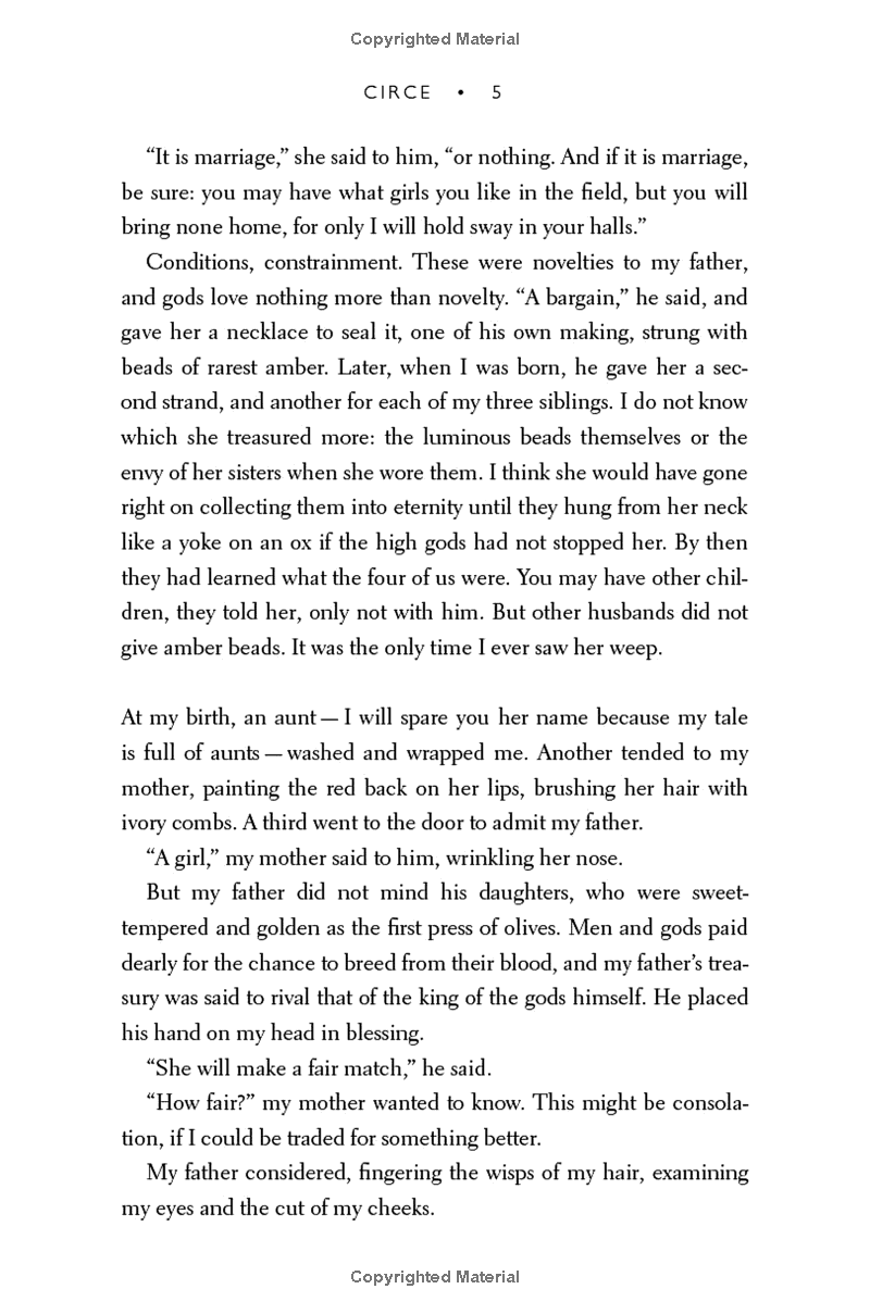 In the house of Helios, god of the sun and mightiest of the Titans, a daughter is born. But Circe is a strange child -- not powerful, like her father, nor viciously alluring like her mother. Turning to the world of mortals for companionship, she discovers that she does possess power -- the power of witchcraft, which can transform rivals into monsters and menace the gods themselves.