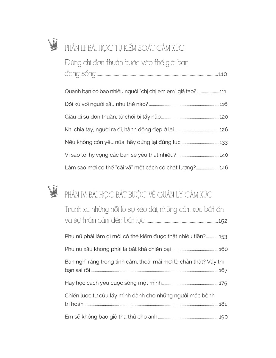 Tôi luôn hy vọng những cô gái đang theo dõi cuốn sách này có thể ít bị tổn thương nhất trong các mối quan hệ. Giữa sự ồn ào náo nhiệt của thế giới này, hãy cứ giữ cho mình một trái tim yên vui và điều làm nên sự thu hút nhất của người phụ nữ hiện đại chính là độc lập, tự chủ và có chính kiến riêng của mình.