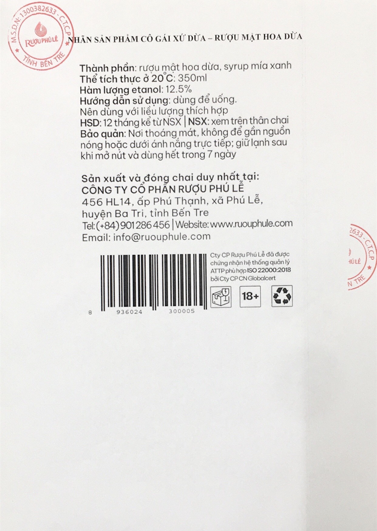 Cô Gái Xứ Dừa với thành phần từ mật hoa dừa lên men, mang đến cảm giác chua thanh, dịu ngọt. Sản phẩm phù hợp để uống khai vị và nhâm nhi trong lúc chuyện trò, Thành phần: rượu mật hoa dừa, syrup mía xanh Thể tích thực ở 20 độ C: 350ml Hàm lượng etanol: 12.5% Hướng dẫn sử dụng: dùng để uống, nên dùng với liều lượng thích hợp HSD: 12 tháng Bảo quản: nơi thoáng mát, không để gần nguồn nóng hoặc dưới ánh nắng trực tiếp; giữ lạnh sau khi mở nút và dùng hết trong 7 ngày Sản xuất và đóng chai duy nhất tại: CÔNG TY CỔ PHẦN RƯỢU PHÚ LỄ