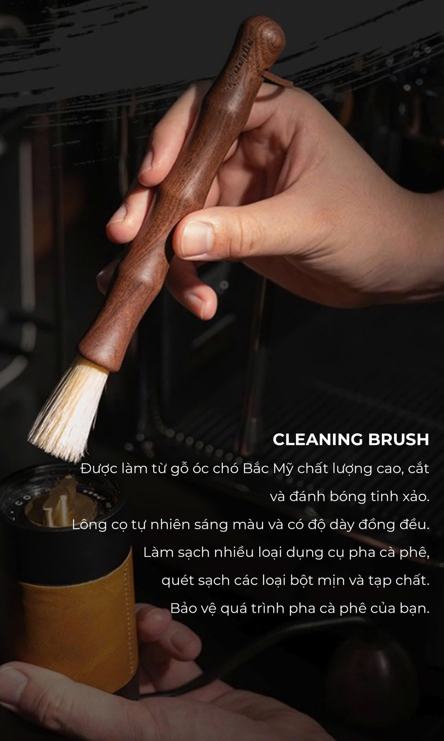 CỌ QUÉT CÀ PHÊ CÁN GỖ ỐC CHÓ FEEPIE Sau mỗi lần pha espresso , cà phê còn sót lại trong portafiler . Nếu trong khả năng cho phép , chúng ta nên rửa portafilter với nước để loại bỏ hoàn toàn bột cà phê cũ còn sót lại . Nhưng nếu trong giờ cao điểm , bạn cần pha liên tục thì cọ vệ sinh máy là một giải pháp cho bạn . Với sợi cọ mềm mại , bạn chỉ cần quét nhẹ portafilter và các bộ phận khác của máy pha cà phê espresso để loại bỏ bột và bụi cà phê một cách nhanh chống và hiệu quả nhất . Sử dụng để quét sạch bột cà phê trong portafilter . Thiết kế đầu cọ tròn dễ dàng sử dụng . Sợi cọ mềm mại quét sạch nhanh chóng .